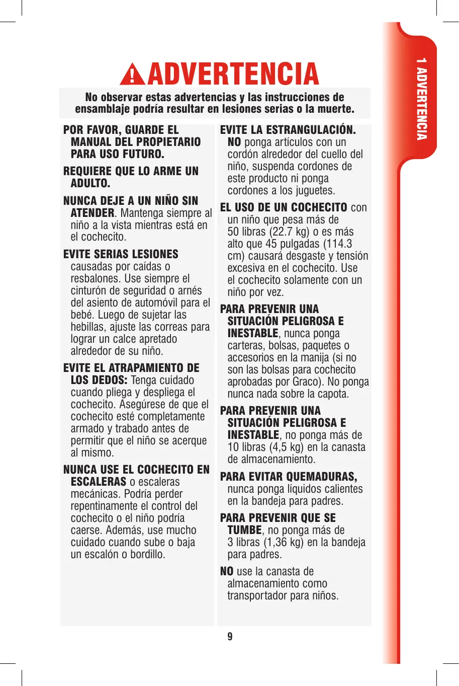 NUNCA PONGA al niño en el asiento para niño pequeño con la cabeza hacia el apoyapiés. NUNCA DEJE QUE EL COCHECITO se use como un juguete. EL COCHECITO DEBE USARSE solamente a la velocidad del caminar. El producto no debe usarse para correr, patinar, etc. NUNCA LEVANTE NI TRANSPORTE el cochecito agarrado del apoyapiés. DEJE DE USAR SU COCHECITO si resulta dañado o roto