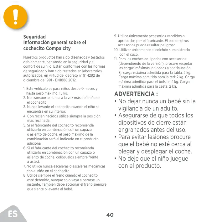 Seguridad Información general sobre el cochecito Compa’city Nuestros productos han sido diseñados y testados debidamente, pensando en la seguridad y el confort de su hijo. Están conformes con las normas de seguridad y han sido testados en laboratorios autorizados, en virtud del decreto n° 91-1292 de diciembre de 1991 - EN1888:2012.