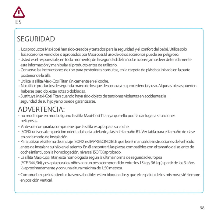 • Antes de comprarla, compruebe que la sillita es apta para su coche. • ISOFIX universal en posición orientada hacia adelante, clase de tamaño B1. Ver tabla para el tamaño de clase en cada modo de instalación • Para utilizar el sistema de anclaje ISOFIX es IMPRESCINDIBLE que lea el manual de instrucciones del vehículo antes de instalar a su hijo en el asiento. En él encontrará las plazas compatibles con el tamaño del asiento de coche infantil, con la homologación, niversal ISOFIX aprobado. • La sillita Maxi-Cosi Titan está homologada según la última norma de seguridad europea (ECE R44 /04) y es apta para los niños con un peso comprendido entre los 15kg y 36 kg (a partir de los 3 años ½ aproximadamente y con una altura máxima de 1,50 metros). • Compruebe que los asientos traseros abatibles estén bloqueados y que el respaldo de los mismos esté siempre en posición vertical.