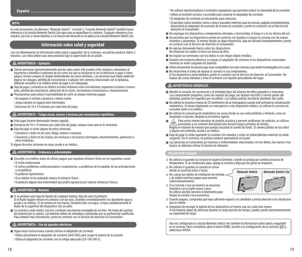 Español NOTA En este documento, los términos “Nintendo Switch”, “consola” y “consola Nintendo Switch” también hacen referencia a la consola Nintendo Switch Lite salvo que se especifique lo contrario. Cualquier referencia a los mandos Joy-Con, a varias baterías o a la función de vibración no se aplica a la consola Nintendo Switch Lite.