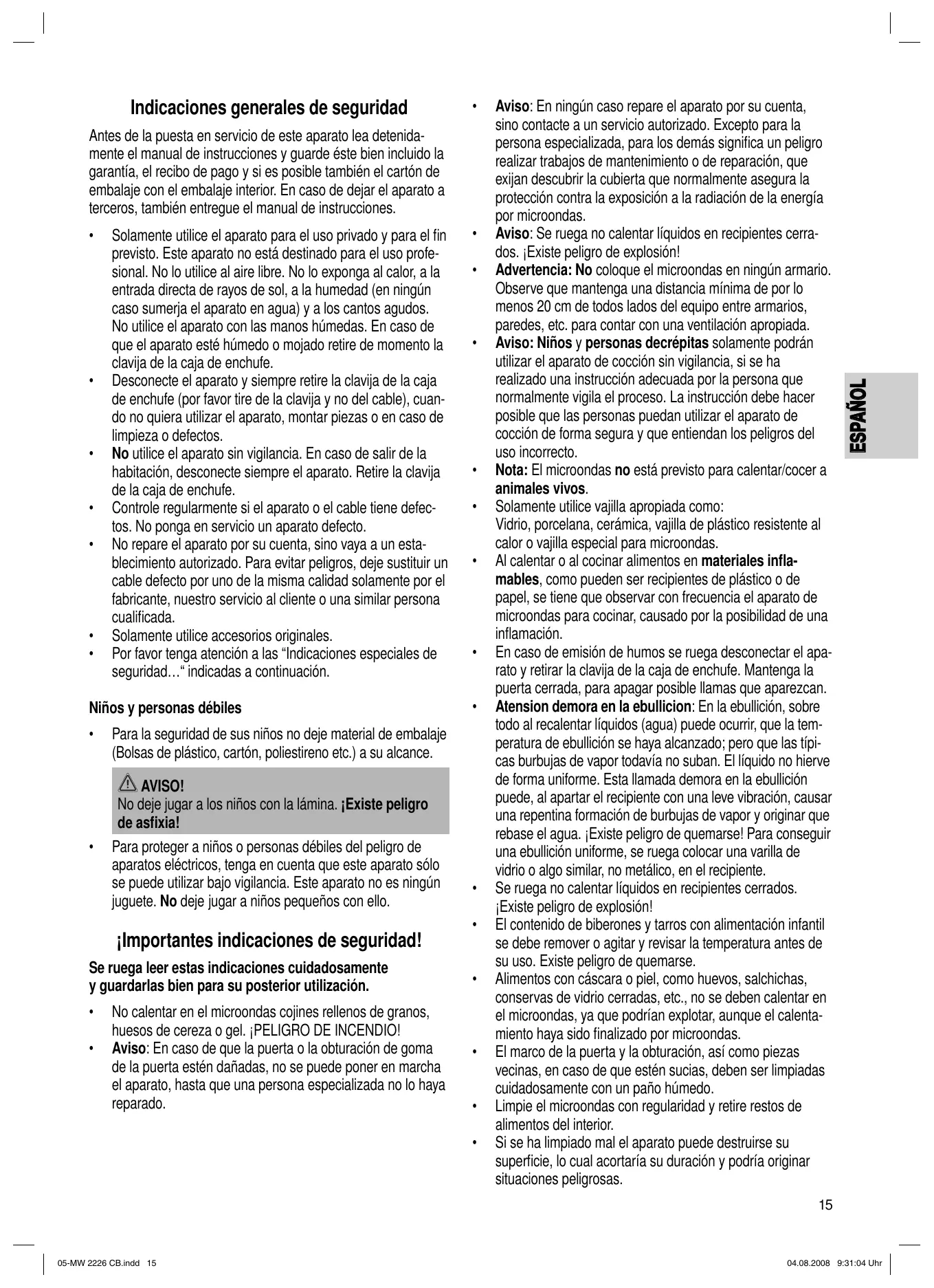 Aviso: En ningún caso repare el aparato por su cuenta, sino contacte a un servicio autorizado. Excepto para la persona especializada, para los demás significa un peligro realizar trabajos de mantenimiento o de reparación, que exijan descubrir la cubierta que normalmente asegura la protección contra la exposición a la radiación de la energía por microondas. Aviso: Se ruega no calentar líquidos en recipientes cerrados. ¡Existe peligro de explosión! Advertencia: No coloque el microondas en ningún armario. Observe que mantenga una distancia mínima de por lo menos 20 cm de todos lados del equipo entre armarios, paredes, etc. para contar con una ventilación apropiada. Aviso: Niños y personas decrépitas solamente podrán utilizar el aparato de cocción sin vigilancia, si se ha realizado una instrucción adecuada por la persona que normalmente vigila el proceso. La instrucción debe hacer posible que las personas puedan utilizar el aparato de cocción de forma segura y que entiendan los peligros del uso incorrecto. Nota: El microondas no está previsto para calentar/cocer a animales vivos. Solamente utilice vajilla apropiada como: Vidrio, porcelana, cerámica, vajilla de plástico resistente al calor o vajilla especial para microondas. Al calentar o al cocinar alimentos en materiales inflamables, como pueden ser recipientes de plástico o de papel, se tiene que observar con frecuencia el aparato de microondas para cocinar, causado por la posibilidad de una inflamación. En caso de emisión de humos se ruega desconectar el aparato y retirar la clavija de la caja de enchufe. Mantenga la puerta cerrada, para apagar posible llamas que aparezcan. Atension demora en la ebullicion: En la ebullición, sobre todo al recalentar líquidos (agua) puede ocurrir, que la temperatura de ebullición se haya alcanzado; pero que las típicas burbujas de vapor todavía no suban. El líquido no hierve de forma uniforme. Esta llamada demora en la ebullición puede, al apartar el recipiente con una leve vibración, causar una repentina formación de burbujas de vapor y originar que rebase el agua. ¡Existe peligro de quemarse! Para conseguir una ebullición uniforme, se ruega colocar una varilla de vidrio o algo similar, no metálico, en el recipiente. Se ruega no calentar líquidos en recipientes cerrados. ¡Existe peligro de explosión! El contenido de biberones y tarros con alimentación infantil se debe remover o agitar y revisar la temperatura antes de su uso. Existe peligro de quemarse. Alimentos con cáscara o piel, como huevos, salchichas, conservas de vidrio cerradas, etc., no se deben calentar en el microondas, ya que podrían explotar, aunque el calentamiento haya sido finalizado por microondas. El marco de la puerta y la obturación, así como piezas vecinas, en caso de que estén sucias, deben ser limpiadas cuidadosamente con un paño húmedo. Limpie el microondas con regularidad y retire restos de alimentos del interior. Si se ha limpiado mal el aparato puede destruirse su superficie, lo cual acortaría su duración y podría originar situaciones peligrosas. ESPAÑOL Indicaciones generales de seguridad