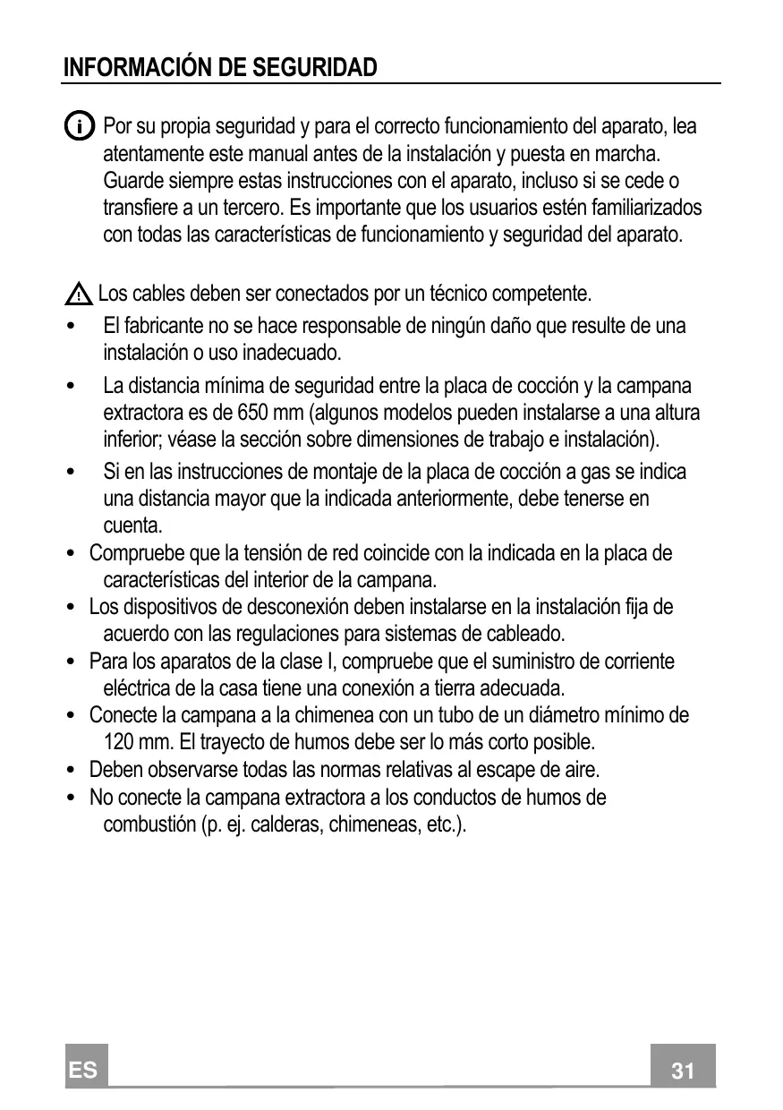 Los cables deben ser conectados por un técnico competente. El fabricante no se hace responsable de ningún daño que resulte de una instalación o uso inadecuado. La distancia mínima de seguridad entre la placa de cocción y la campana extractora es de 650 mm (algunos modelos pueden instalarse a una altura inferior; véase la sección sobre dimensiones de trabajo e instalación). Si en las instrucciones de montaje de la placa de cocción a gas se indica una distancia mayor que la indicada anteriormente, debe tenerse en cuenta. Compruebe que la tensión de red coincide con la indicada en la placa de características del interior de la campana. Los dispositivos de desconexión deben instalarse en la instalación fija de acuerdo con las regulaciones para sistemas de cableado. Para los aparatos de la clase I, compruebe que el suministro de corriente eléctrica de la casa tiene una conexión a tierra adecuada. Conecte la campana a la chimenea con un tubo de un diámetro mínimo de 120 mm. El trayecto de humos debe ser lo más corto posible. Deben observarse todas las normas relativas al escape de aire. No conecte la campana extractora a los conductos de humos de combustión (p. ej. calderas, chimeneas, etc.).