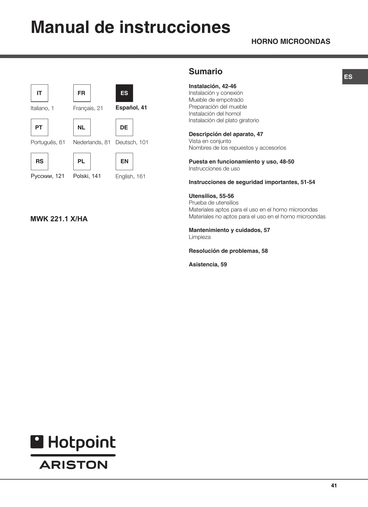 Encuentra gratis el manual del aparato MWA 121.1 X/HA HOTPOINT en formato PDF.