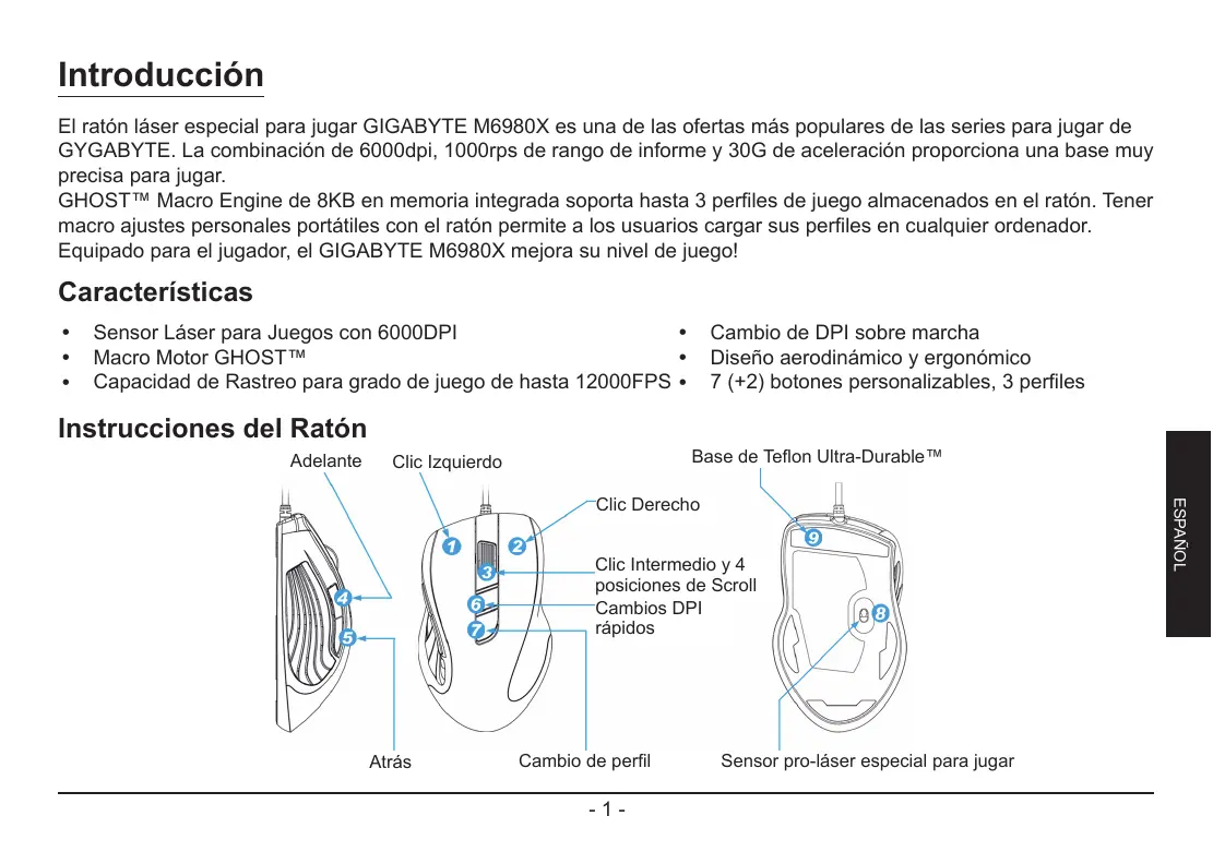 Características yy Sensor Láser para Juegos con 6000DPI yy Cambio de DPI sobre marcha yy Diseño aerodinámico y ergonómico yy Macro Motor GHOST™ yy Capacidad de Rastreo para grado de juego de hasta 12000FPS yy 7 (+2) botones personalizables, 3 perfiles
