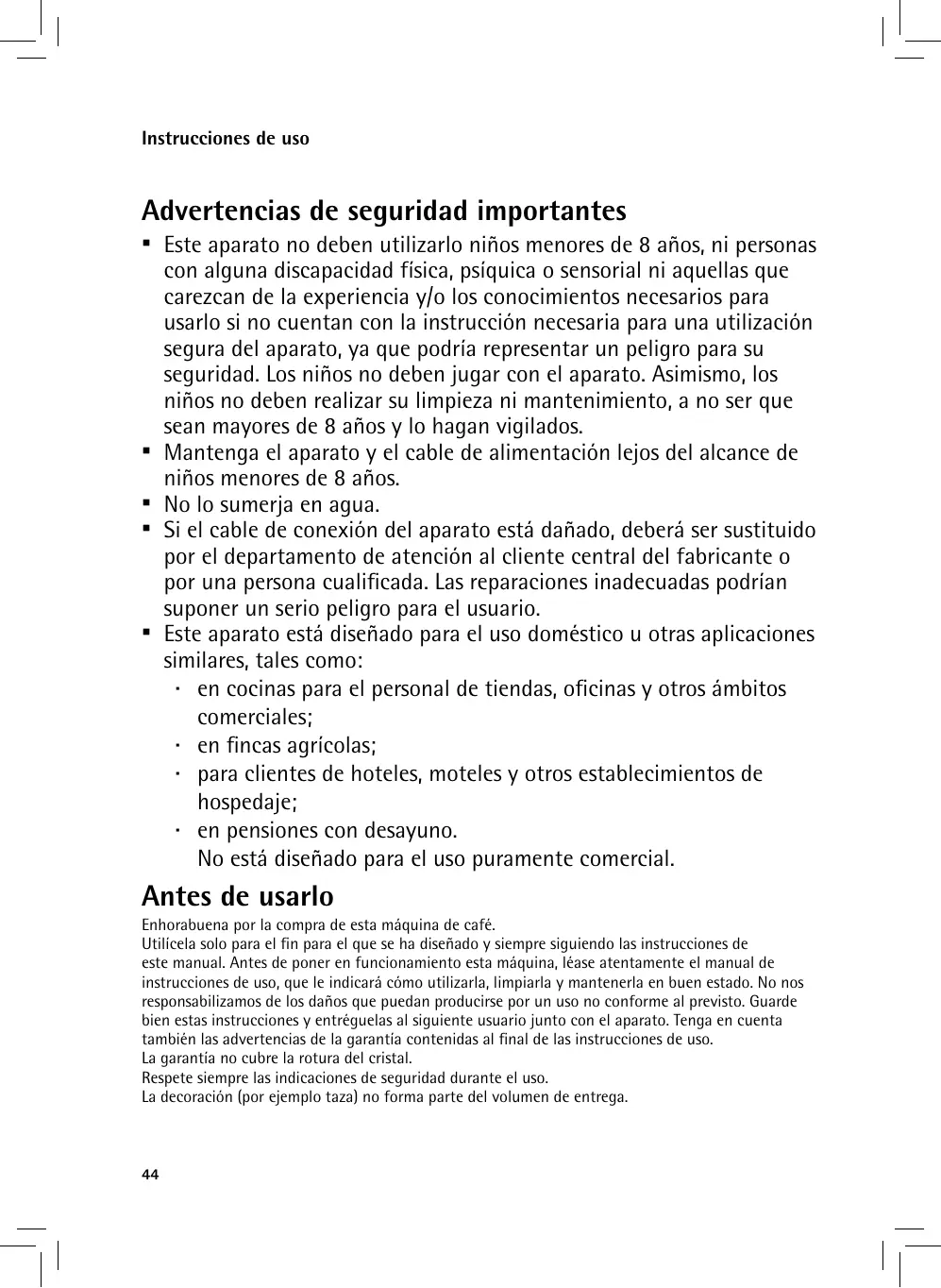 Enhorabuena por la compra de esta máquina de café. Utilícela solo para el fin para el que se ha diseñado y siempre siguiendo las instrucciones de este manual. Antes de poner en funcionamiento esta máquina, léase atentamente el manual de instrucciones de uso, que le indicará cómo utilizarla, limpiarla y mantenerla en buen estado. No nos responsabilizamos de los daños que puedan producirse por un uso no conforme al previsto. Guarde bien estas instrucciones y entréguelas al siguiente usuario junto con el aparato. Tenga en cuenta también las advertencias de la garantía contenidas al final de las instrucciones de uso. La garantía no cubre la rotura del cristal. Respete siempre las indicaciones de seguridad durante el uso. La decoración (por ejemplo taza) no forma parte del volumen de entrega.
