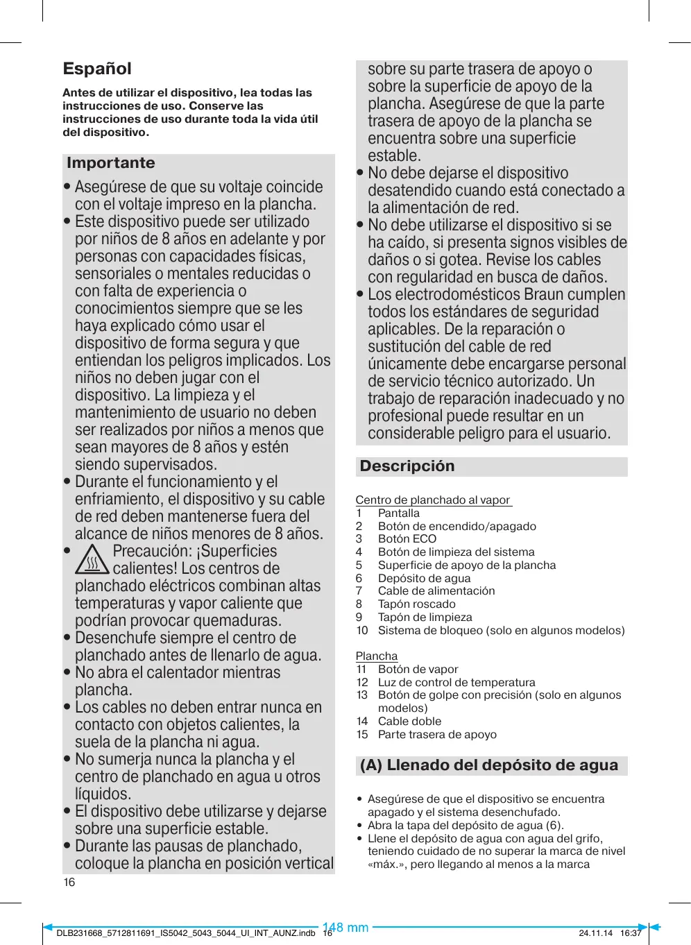 No debe dejarse el dispositivo desatendido cuando está conectado a la alimentación de red. No debe utilizarse el dispositivo si se ha caído, si presenta signos visibles de daños o si gotea. Revise los cables con regularidad en busca de daños. Los electrodomésticos Braun cumplen todos los estándares de seguridad aplicables. De la reparación o sustitución del cable de red únicamente debe encargarse personal de servicio técnico autorizado. Un trabajo de reparación inadecuado y no profesional puede resultar en un considerable peligro para el usuario. Descripción Centro de planchado al vapor 1 Pantalla 2 Botón de encendido/apagado 3 Botón ECO 4 Botón de limpieza del sistema 5 Superficie de apoyo de la plancha 6 Depósito de agua 7 Cable de alimentación 8 Tapón roscado 9 Tapón de limpieza 10 Sistema de bloqueo (solo en algunos modelos) Plancha 11 Botón de vapor 12 Luz de control de temperatura 13 Botón de golpe con precisión (solo en algunos modelos) 14 Cable doble 15 Parte trasera de apoyo