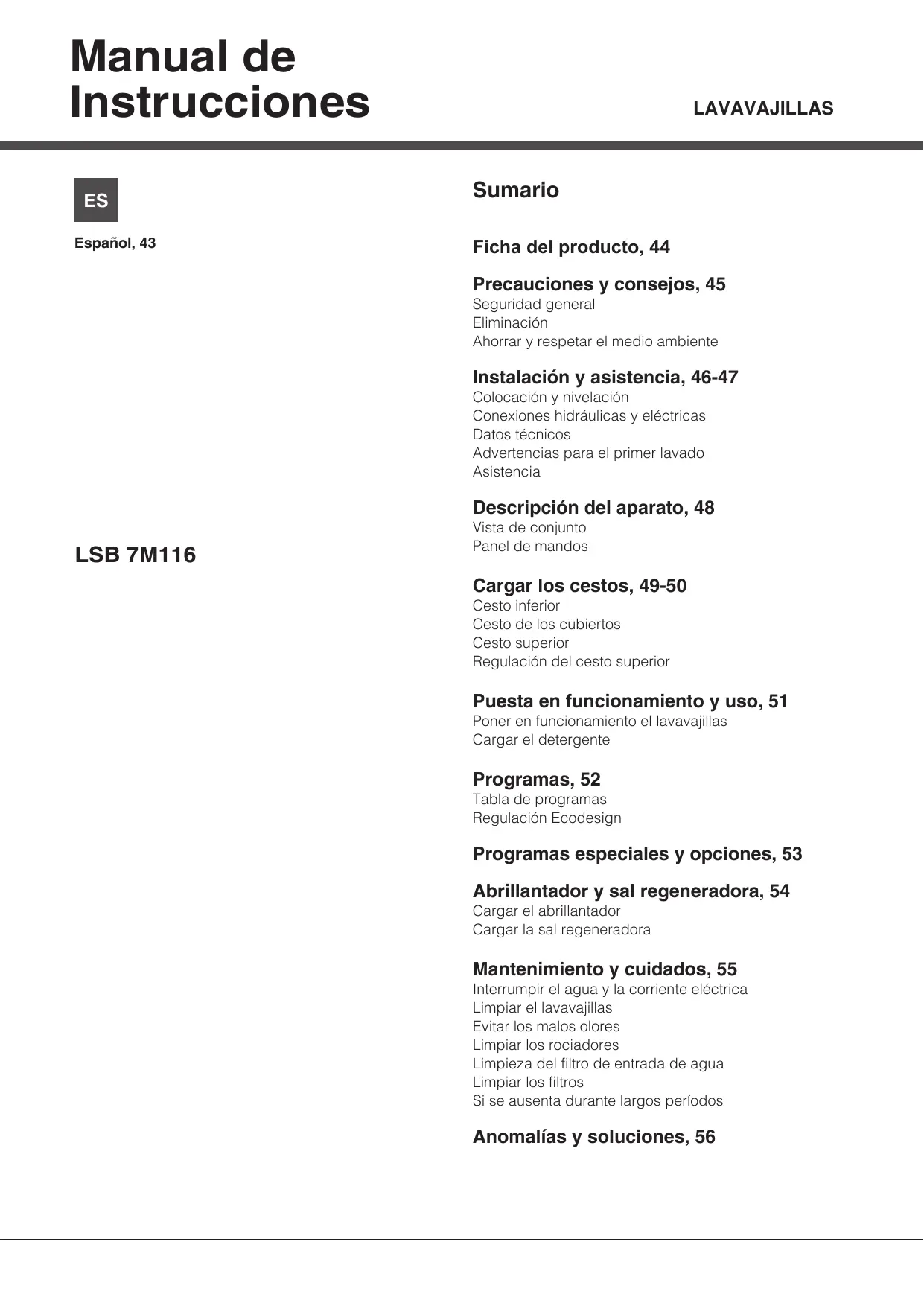 Ficha del producto, 44 Precauciones y consejos, 45 Seguridad general Eliminación Ahorrar y respetar el medio ambiente