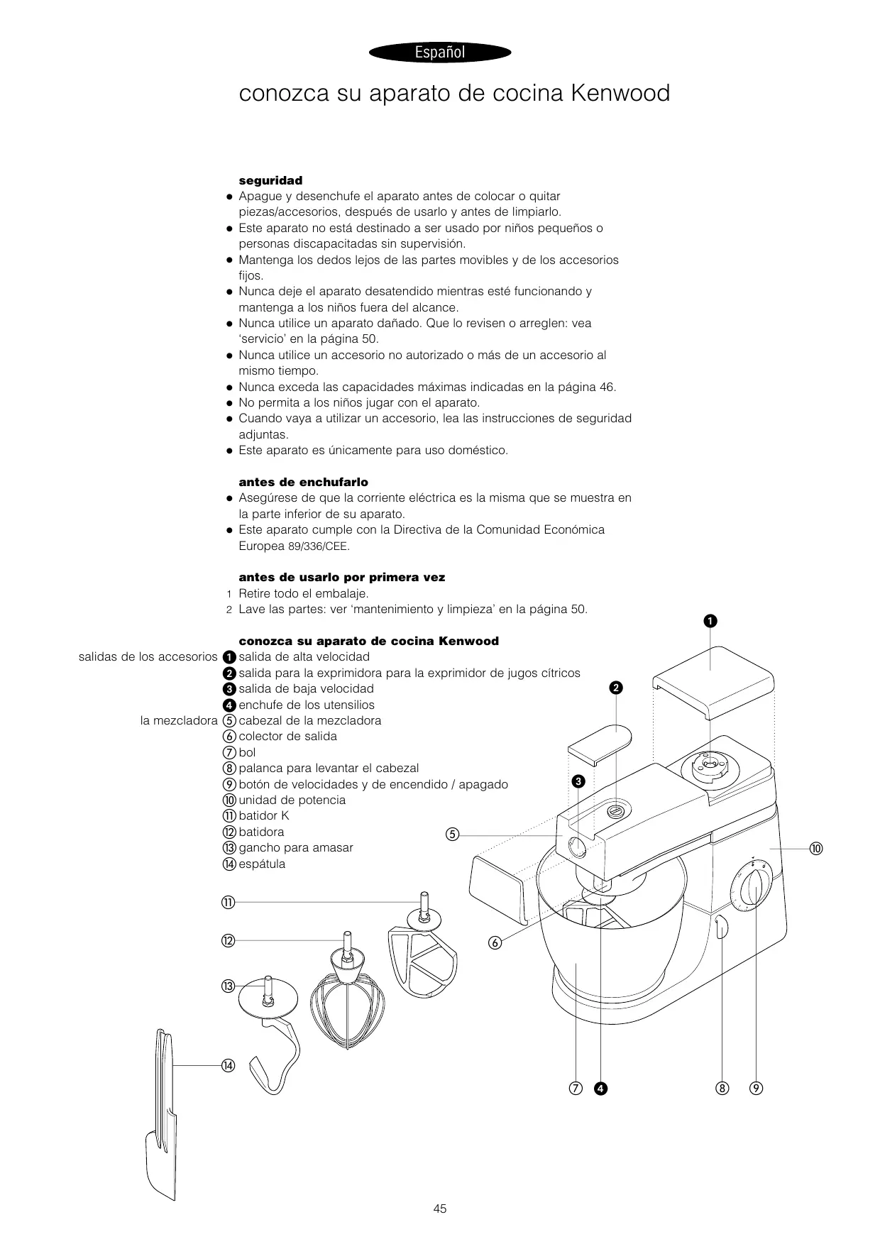 Apague y desenchufe el aparato antes de colocar o quitar piezas/accesorios, después de usarlo y antes de limpiarlo. Este aparato no está destinado a ser usado por niños pequeños o personas discapacitadas sin supervisión. Mantenga los dedos lejos de las partes movibles y de los accesorios fijos. Nunca deje el aparato desatendido mientras esté funcionando y mantenga a los niños fuera del alcance. Nunca utilice un aparato dañado. Que lo revisen o arreglen: vea ‘servicio’ en la página 50. Nunca utilice un accesorio no autorizado o más de un accesorio al mismo tiempo. Nunca exceda las capacidades máximas indicadas en la página 46. No permita a los niños jugar con el aparato. Cuando vaya a utilizar un accesorio, lea las instrucciones de seguridad adjuntas. Este aparato es únicamente para uso doméstico. antes de enchufarlo Asegúrese de que la corriente eléctrica es la misma que se muestra en la parte inferior de su aparato. Este aparato cumple con la Directiva de la Comunidad Económica Europea 89/336/CEE. antes de usarlo por primera vez