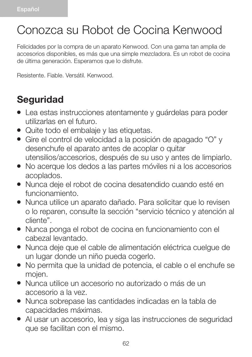 Felicidades por la compra de un aparato Kenwood. Con una gama tan amplia de accesorios disponibles, es más que una simple mezcladora. Es un robot de cocina de última generación. Esperamos que lo disfrute. Resistente. Fiable. Versátil. Kenwood.