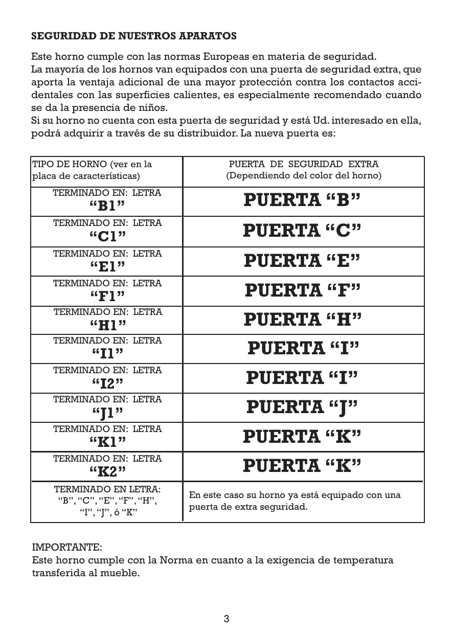 La mayoría de los hornos van equipados con una puerta de seguridad extra, que aporta la ventaja adicional de una mayor protección contra los contactos accidentales con las superficies calientes, es especialmente recomendado cuando se da la presencia de niños. Si su horno no cuenta con esta puerta de seguridad y está Ud. interesado en ella, podrá adquirir a través de su distribuidor. La nueva puerta es: TIPO DE HORNO (ver en la placa de características)