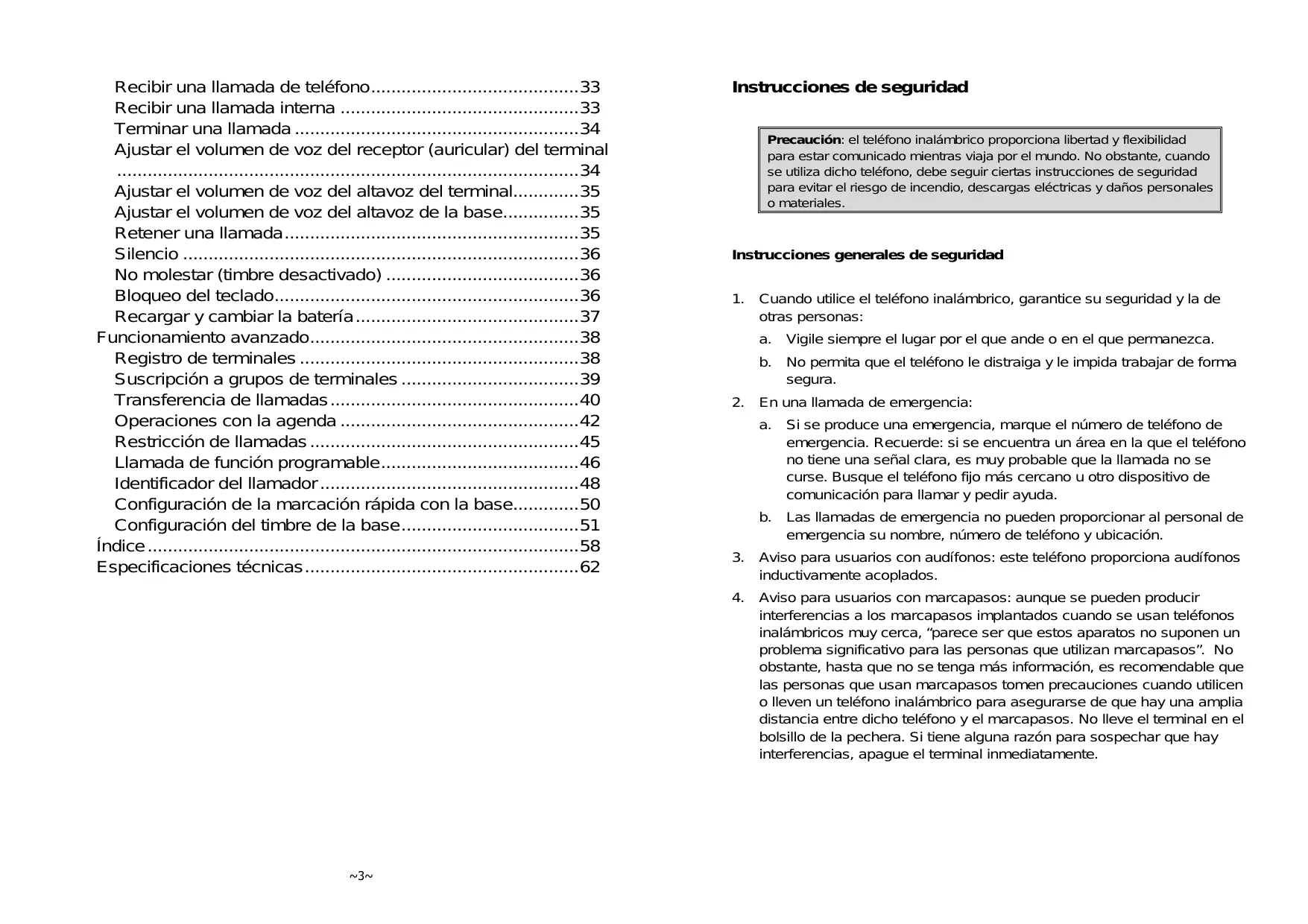 - Especificaciones técnicas Instrucciones de seguridad Precaución: el teléfono inalámbrico proporciona libertad y flexibilidad para estar comunicado mientras viaja por el mundo. No obstante, cuando se utiliza dicho teléfono, debe seguir ciertas instrucciones de seguridad para evitar el riesgo de incendio, descargas eléctricas y daños personales o materiales. Instrucciones generales de seguridad p. 62