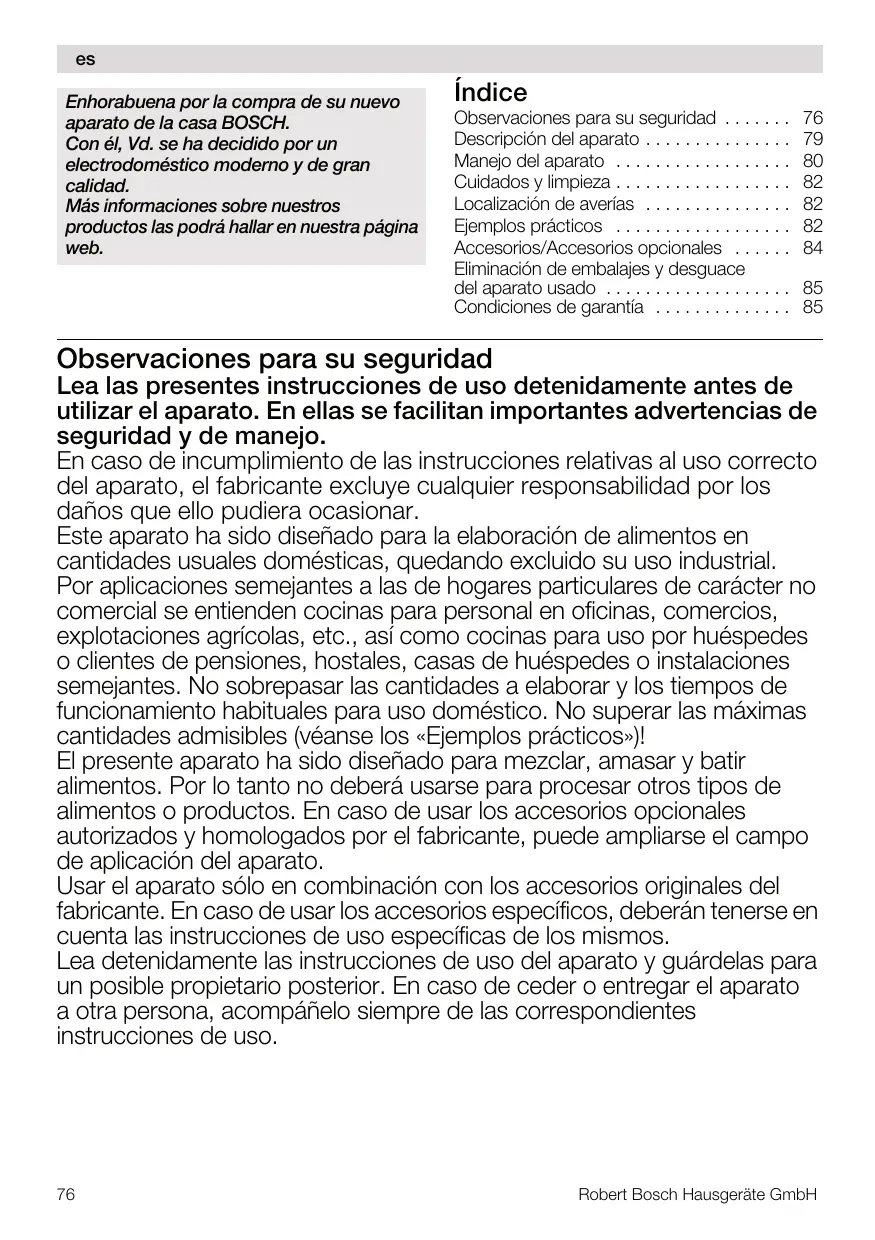 Observaciones para su seguridad Lea las presentes instrucciones de uso detenidamente antes de utilizar el aparato. En ellas se facilitan importantes advertencias de seguridad y de manejo. En caso de incumplimiento de las instrucciones relativas al uso correcto del aparato, el fabricante excluye cualquier responsabilidad por los daños que ello pudiera ocasionar. Este aparato ha sido diseñado para la elaboración de alimentos en cantidades usuales domésticas, quedando excluido su uso industrial. Por aplicaciones semejantes a las de hogares particulares de carácter no comercial se entienden cocinas para personal en oficinas, comercios, explotaciones agrícolas, etc., así como cocinas para uso por huéspedes o clientes de pensiones, hostales, casas de huéspedes o instalaciones semejantes. No sobrepasar las cantidades a elaborar y los tiempos de funcionamiento habituales para uso doméstico. No superar las máximas cantidades admisibles (véanse los «Ejemplos prácticos»)! El presente aparato ha sido diseñado para mezclar, amasar y batir alimentos. Por lo tanto no deberá usarse para procesar otros tipos de alimentos o productos. En caso de usar los accesorios opcionales autorizados y homologados por el fabricante, puede ampliarse el campo de aplicación del aparato. Usar el aparato sólo en combinación con los accesorios originales del fabricante. En caso de usar los accesorios específicos, deberán tenerse en cuenta las instrucciones de uso específicas de los mismos. Lea detenidamente las instrucciones de uso del aparato y guárdelas para un posible propietario posterior. En caso de ceder o entregar el aparato a otra persona, acompáñelo siempre de las correspondientes instrucciones de uso.