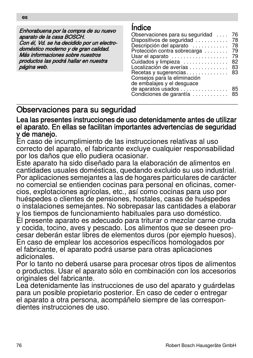 Enhorabuena por la compra de su nuevo aparato de la casa BOSCH. Con él, Vd. se ha decidido por un electrodoméstico moderno y de gran calidad. Más informaciones sobre nuestros productos las podrá hallar en nuestra página web. Índice Observaciones para su seguridad . . . . Dispositivos de seguridad . . . . . . . . . . . Descripción del aparato . . . . . . . . . . . . Protección contra sobrecarga . . . . . . . . Usar el aparato . . . . . . . . . . . . . . . . . . . Cuidados y limpieza . . . . . . . . . . . . . . . Localización de averías . . . . . . . . . . . . . Recetas y sugerencias . . . . . . . . . . . . . . Consejos para la eliminación de embalajes y el desguace de aparatos usados . . . . . . . . . . . . . . . . Condiciones de garantía . . . . . . . . . . . .