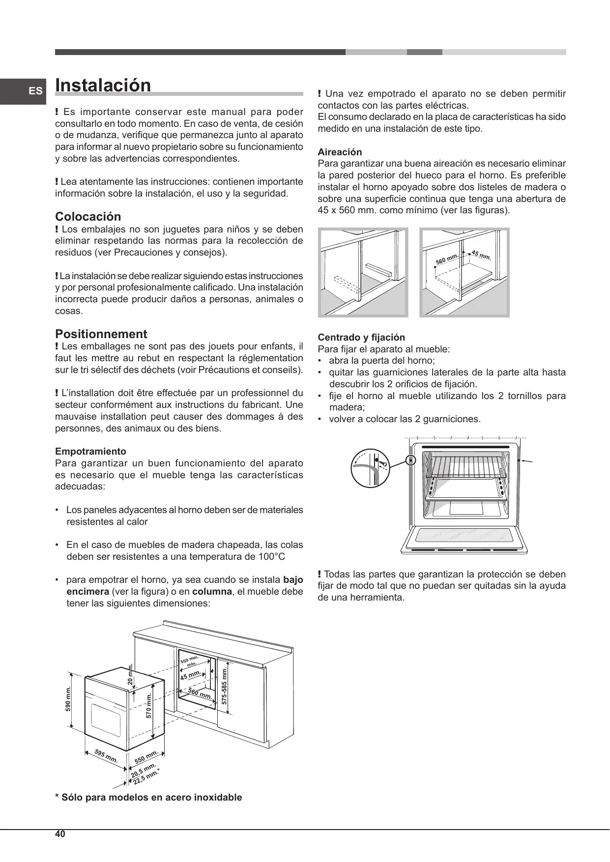 Instalación ! Es importante conservar este manual para poder consultarlo en todo momento. En caso de venta, de cesión o de mudanza, verifique que permanezca junto al aparato para informar al nuevo propietario sobre su funcionamiento y sobre las advertencias correspondientes. ! Lea atentamente las instrucciones: contienen importante información sobre la instalación, el uso y la seguridad. Colocación ! Los embalajes no son juguetes para niños y se deben eliminar respetando las normas para la recolección de residuos (ver Precauciones y consejos). ! Una vez empotrado el aparato no se deben permitir contactos con las partes eléctricas. El consumo declarado en la placa de características ha sido medido en una instalación de este tipo. Aireación Para garantizar una buena aireación es necesario eliminar la pared posterior del hueco para el horno. Es preferible instalar el horno apoyado sobre dos listeles de madera o sobre una superficie continua que tenga una abertura de 45 x 560 mm. como mínimo (ver las figuras).