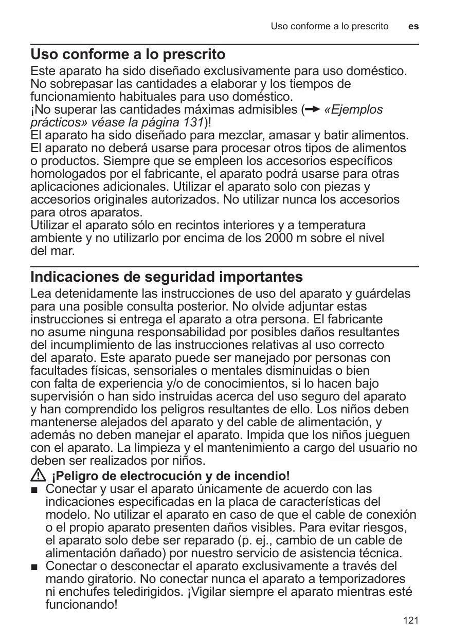 Este aparato ha sido diseñado exclusivamente para uso doméstico. No sobrepasar las cantidades a elaborar y los tiempos de funcionamiento habituales para uso doméstico. ¡No superar las cantidades máximas admisibles (X «Ejemplos prácticos» véase la página 131)! El aparato ha sido diseñado para mezclar, amasar y batir alimentos. El aparato no deberá usarse para procesar otros tipos de alimentos o productos. Siempre que se empleen los accesorios específicos homologados por el fabricante, el aparato podrá usarse para otras aplicaciones adicionales. Utilizar el aparato solo con piezas y accesorios originales autorizados. No utilizar nunca los accesorios para otros aparatos. Utilizar el aparato sólo en recintos interiores y a temperatura ambiente y no utilizarlo por encima de los 2000 m sobre el nivel del mar. Indicaciones de seguridad importantes Lea detenidamente las instrucciones de uso del aparato y guárdelas para una posible consulta posterior. No olvide adjuntar estas instrucciones si entrega el aparato a otra persona. El fabricante no asume ninguna responsabilidad por posibles daños resultantes del incumplimiento de las instrucciones relativas al uso correcto del aparato. Este aparato puede ser manejado por personas con facultades físicas, sensoriales o mentales disminuidas o bien con falta de experiencia y/o de conocimientos, si lo hacen bajo supervisión o han sido instruidas acerca del uso seguro del aparato y han comprendido los peligros resultantes de ello. Los niños deben mantenerse alejados del aparato y del cable de alimentación, y además no deben manejar el aparato. Impida que los niños jueguen con el aparato. La limpieza y el mantenimiento a cargo del usuario no deben ser realizados por niños. WW ¡Peligro de electrocución y de incendio! ■■ Conectar y usar el aparato únicamente de acuerdo con las indicaciones especificadas en la placa de características del modelo. No utilizar el aparato en caso de que el cable de conexión o el propio aparato presenten daños visibles. Para evitar riesgos, el aparato solo debe ser reparado (p. ej., cambio de un cable de alimentación dañado) por nuestro servicio de asistencia técnica. ■■ Conectar o desconectar el aparato exclusivamente a través del mando giratorio. No conectar nunca el aparato a temporizadores ni enchufes teledirigidos. ¡Vigilar siempre el aparato mientras esté funcionando!