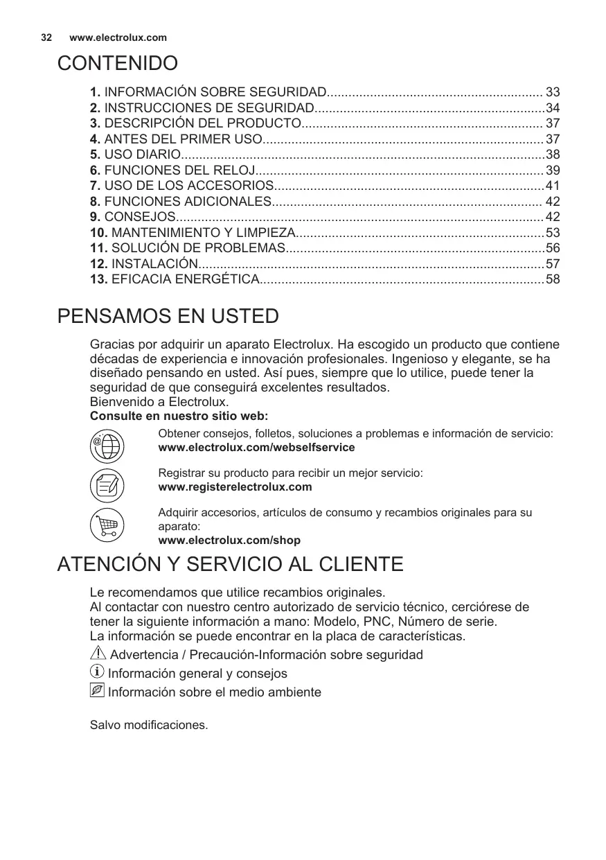 Gracias por adquirir un aparato Electrolux. Ha escogido un producto que contiene décadas de experiencia e innovación profesionales. Ingenioso y elegante, se ha diseñado pensando en usted. Así pues, siempre que lo utilice, puede tener la seguridad de que conseguirá excelentes resultados. Bienvenido a Electrolux. Consulte en nuestro sitio web: Obtener consejos, folletos, soluciones a problemas e información de servicio: www.electrolux.com/webselfservice Registrar su producto para recibir un mejor servicio: www.registerelectrolux.com Adquirir accesorios, artículos de consumo y recambios originales para su aparato: www.electrolux.com/shop