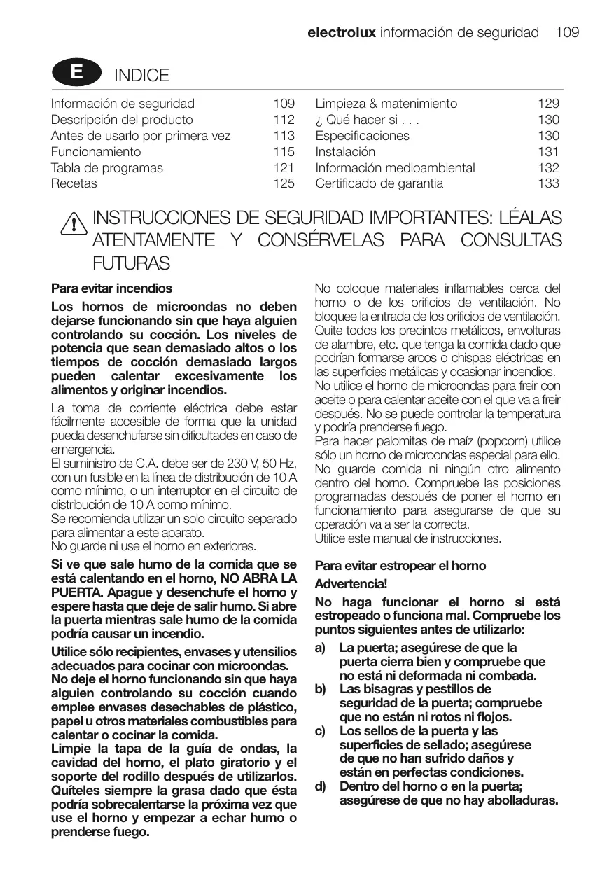Si la lámpara se estropea, consúltelo con su distribuidor o con un técnico de servicio ELECTROLUX autorizado. Si se estropea el cable de alimentación de este aparato, deberá cambiarlo por un cable especial. El cambio debe efectuarlo un técnico de servicio ELECTROLUX autorizado. Para evitar el riesgo de explosión y ebullición repentina: Advertencia! No caliente líquidos ni otros alimentos en recipientes cerrados ya que podrían explotar. No use nunca recipientes o envases sellados. Quite los cierres y tapas antes de utilizarlos. Los recipientes sellados pueden explotar al acumularse la presión incluso después de haber apagado el horno. Tenga cuidado cuando caliente líquidos en el horno de microondas. Utilice un recipiente de boca ancha para que puedan escapar las burbujas. El calentamiento de bebidas en el microondas puede dar lugar a un retraso en la ebullición, por lo tanto el cuidado tiene que ser tomado al manejar el envase. Para evitar la salida repentina de líquido hirviendo y las posibles quemaduras: 1. Agite el líquido antes de calentarlo/ recalentarlo. 2. Es aconsejable introducir una varilla de vidrio o utensilio similar en el líquido mientras calienta. 3. Deje el líquido en reposo al final del tiempo de cocción por 20 segundos, para evitar que hierva y salpique después. No cocine huevos con la cáscara ni caliente huevos cocidos duros enteros en hornos microondas ya que podrían explotar incluso después de haber terminado de calentarlos el microondas. Para cocinar o volver a calentar huevos que no estén mezclados o revueltos, pinche las yemas y las claras para que no exploten. Corte también los huevos duros con cáscara antes de calentarlos en el horno de microondas. Agujeree la piel o cáscara de alimentos como las patatas, salchichas y fruta antes de cocinarlos porque si no podrían explotar.