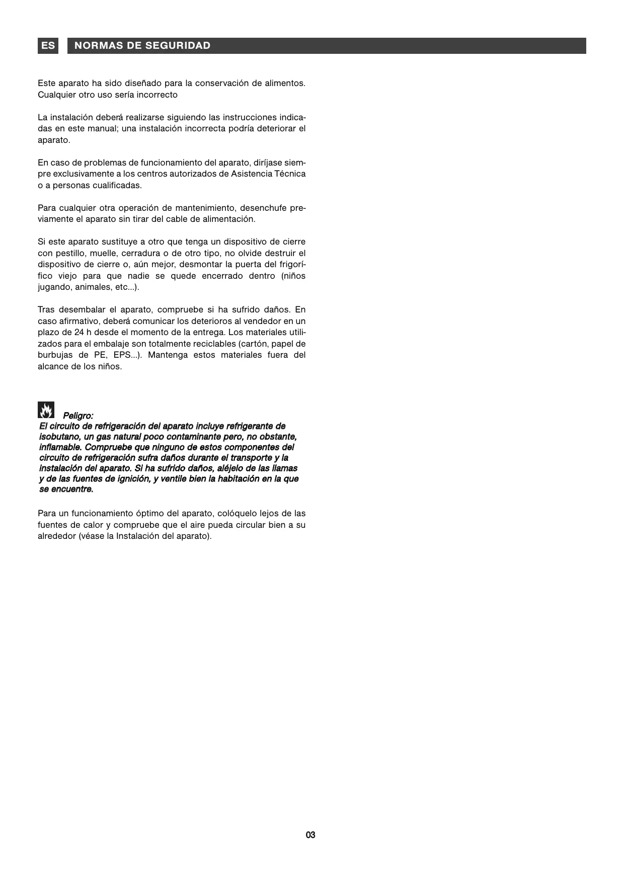Este aparato ha sido diseñado para la conservación de alimentos. Cualquier otro uso sería incorrecto La instalación deberá realizarse siguiendo las instrucciones indicadas en este manual; una instalación incorrecta podría deteriorar el aparato. En caso de problemas de funcionamiento del aparato, diríjase siempre exclusivamente a los centros autorizados de Asistencia Técnica o a personas cualificadas. Para cualquier otra operación de mantenimiento, desenchufe previamente el aparato sin tirar del cable de alimentación. Si este aparato sustituye a otro que tenga un dispositivo de cierre con pestillo, muelle, cerradura o de otro tipo, no olvide destruir el dispositivo de cierre o, aún mejor, desmontar la puerta del frigorífico viejo para que nadie se quede encerrado dentro (niños jugando, animales, etc…). Tras desembalar el aparato, compruebe si ha sufrido daños. En caso afirmativo, deberá comunicar los deterioros al vendedor en un plazo de 24 h desde el momento de la entrega. Los materiales utilizados para el embalaje son totalmente reciclables (cartón, papel de burbujas de PE, EPS…). Mantenga estos materiales fuera del alcance de los niños. Peligro: El circuito de refrigeración del aparato incluye refrigerante de isobutano, un gas natural poco contaminante pero, no obstante, inflamable. Compruebe que ninguno de estos componentes del circuito de refrigeración sufra daños durante el transporte y la instalación del aparato. Si ha sufrido daños, aléjelo de las llamas y de las fuentes de ignición, y ventile bien la habitación en la que se encuentre. Para un funcionamiento óptimo del aparato, colóquelo lejos de las fuentes de calor y compruebe que el aire pueda circular bien a su alrededor (véase la Instalación del aparato).