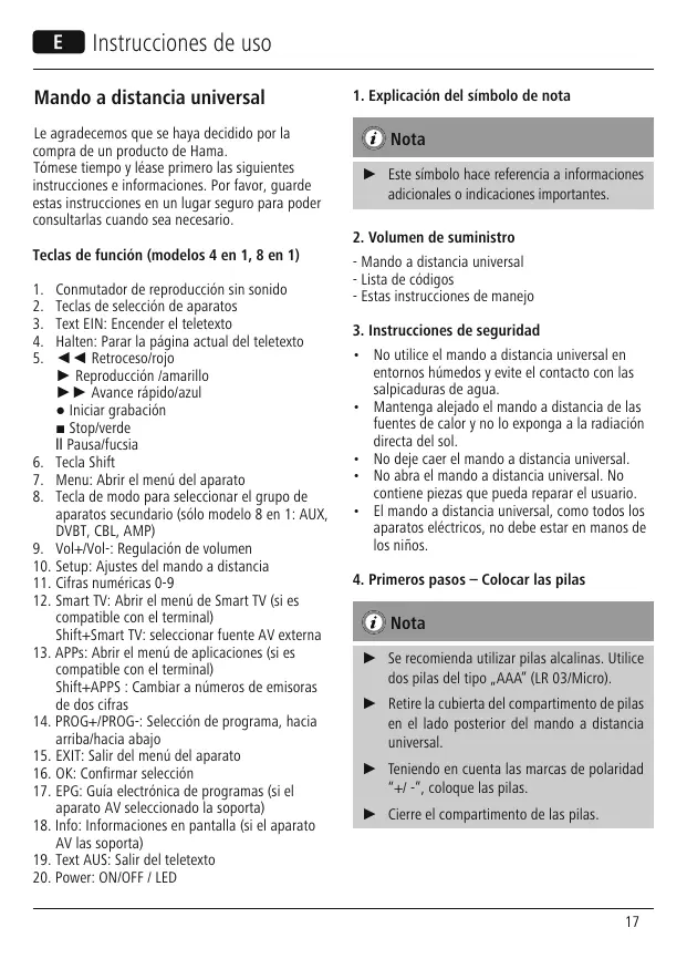 E Instrucciones de uso Mando a distancia universal Le agradecemos que se haya decidido por la compra de un producto de Hama. Tómese tiempo y léase primero las siguientes instrucciones e informaciones. Por favor, guarde estas instrucciones en un lugar seguro para poder consultarlas cuando sea necesario. Teclas de función (modelos 4 en 1, 8 en 1) 1. 2. 3. 4. 5.
