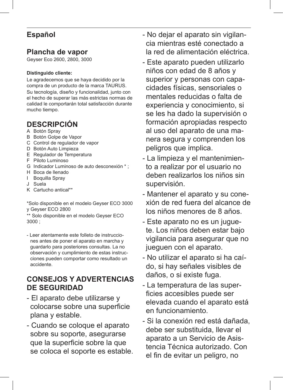 - Pasar la plancha de arriba abajo pulsando el mando vapor ( B ). Importante: para el algodón y el lino se aconseja poner la base de la plancha en contacto con el tejido. Para otros tejidos más delicados se aconseja tener la base de la plancha a unos centímetros de distancia. FUNCIÓN AUTO-DESCONEXIÓN (AUTO-OFF): * - Con la finalidad del ahorro energético, el aparato pasa al estadio de auto-desconexión (auto-off) si no se mueve durante un determinado periodo de tiempo. Cuándo esto suceda, se escuchara un aviso sonoro y el indicador luminoso de auto-desconexión (G) parpadeará para indicar que esta función esta activada. - Auto apagado en posición horizontal: tras aproximadamente 30 segundos, sin mover el aparato. - Auto apagado en posición vertical: tras aproximadamente 8 minutos, sin mover el aparato - Para volver al funcionamiento normal simplemente deberá mover de nuevo el aparato. *Solo disponible en el modelo Geyser ECO 3000 y Geyser ECO 2800 UNA VEZ FINALIZADO EL USO DEL APARATO: - Seleccionar la posición de mínimo (MIN) mediante el mando selector de temperatura. - Desenchufar el aparato de la red eléctrica. - Retirar el agua del depósito. - Limpiar el aparato