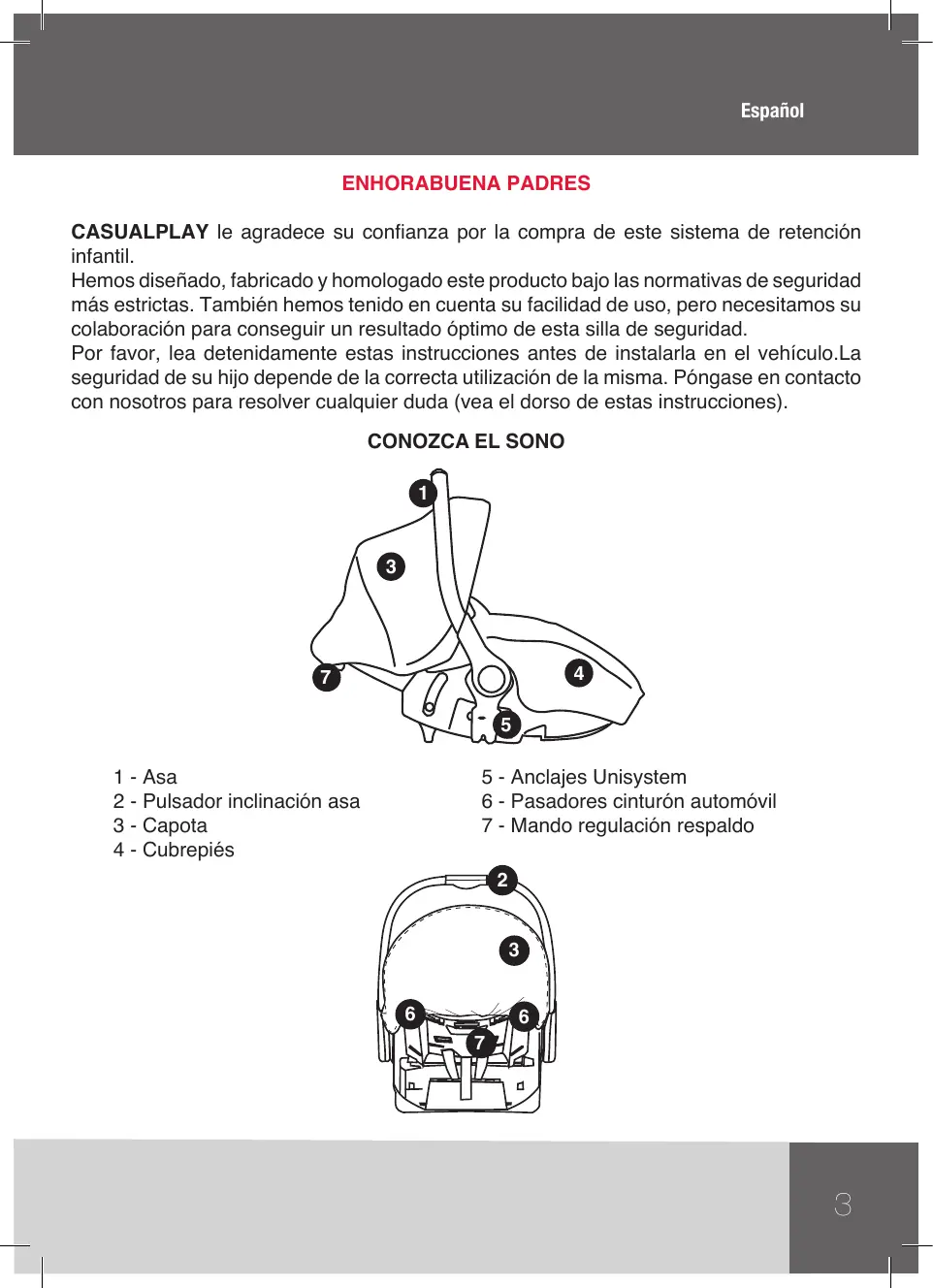 ENHORABUENA PADRES CASUALPLAY le agradece su confianza por la compra de este sistema de retención infantil. Hemos diseñado, fabricado y homologado este producto bajo las normativas de seguridad más estrictas. También hemos tenido en cuenta su facilidad de uso, pero necesitamos su colaboración para conseguir un resultado óptimo de esta silla de seguridad. Por favor, lea detenidamente estas instrucciones antes de instalarla en el vehículo.La seguridad de su hijo depende de la correcta utilización de la misma. Póngase en contacto con nosotros para resolver cualquier duda (vea el dorso de estas instrucciones). CONOZCA EL SONO 1 3