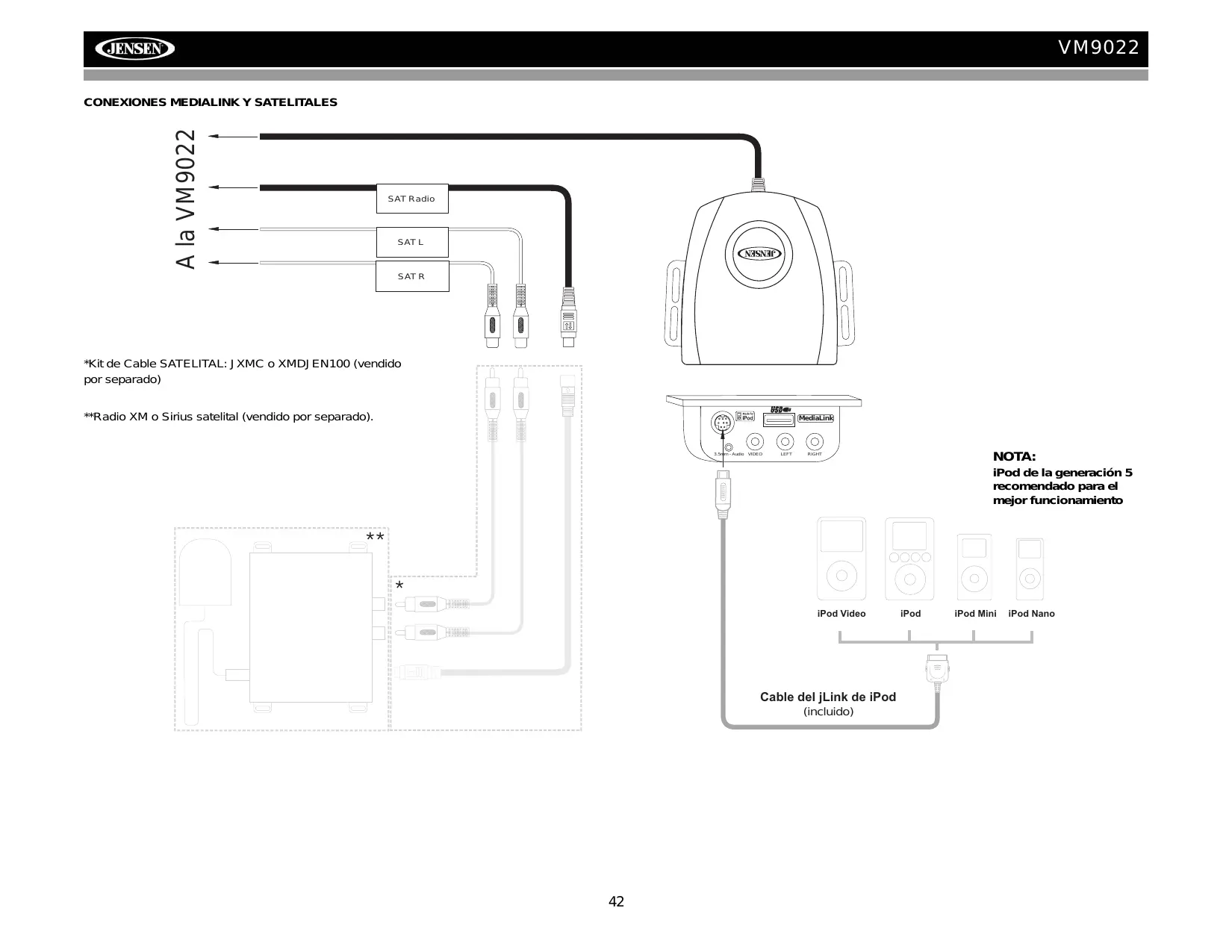 WHITE/BLACK(-) REAR L CABLEADO Cable del Módulo de los Medios / NEGRO AUX IN 1 *MediaLink HEADPHONE MULTIZONE Auricular Inalámbrico Infrarrojo (opcional) VM9022 A la VM9022 *Kit de Cable SATELITAL: JXMC o XMDJEN100 (vendido por separado) **Radio XM o Sirius satelital (vendido por separado). MediaLink iPod de la generación 5 recomendado para el mejor funcionamiento Cable del jLink de iPod (incluido)