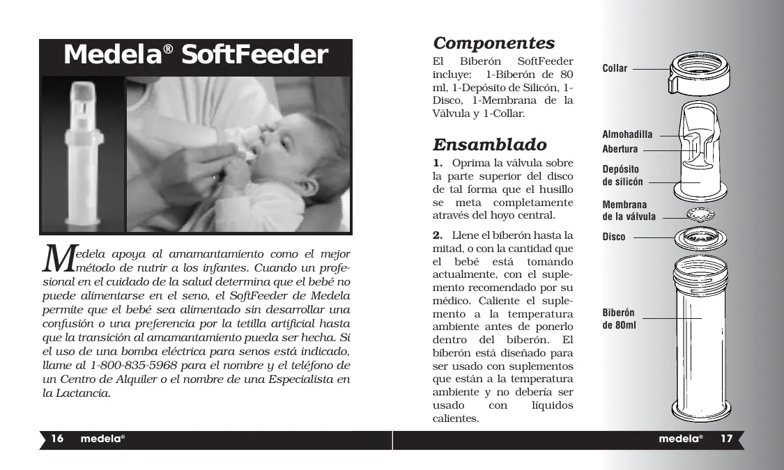 edela apoya al amamantamiento como el mejor método de nutrir a los infantes. Cuando un profesional en el cuidado de la salud determina que el bebé no puede alimentarse en el seno, el SoftFeeder de Medela permite que el bebé sea alimentado sin desarrollar una confusión o una preferencia por la tetilla artificial hasta que la transición al amamantamiento pueda ser hecha. Si el uso de una bomba eléctrica para senos está indicado, llame al 1-800-835-5968 para el nombre y el teléfono de un Centro de Alquiler o el nombre de una Especialista en la Lactancia.