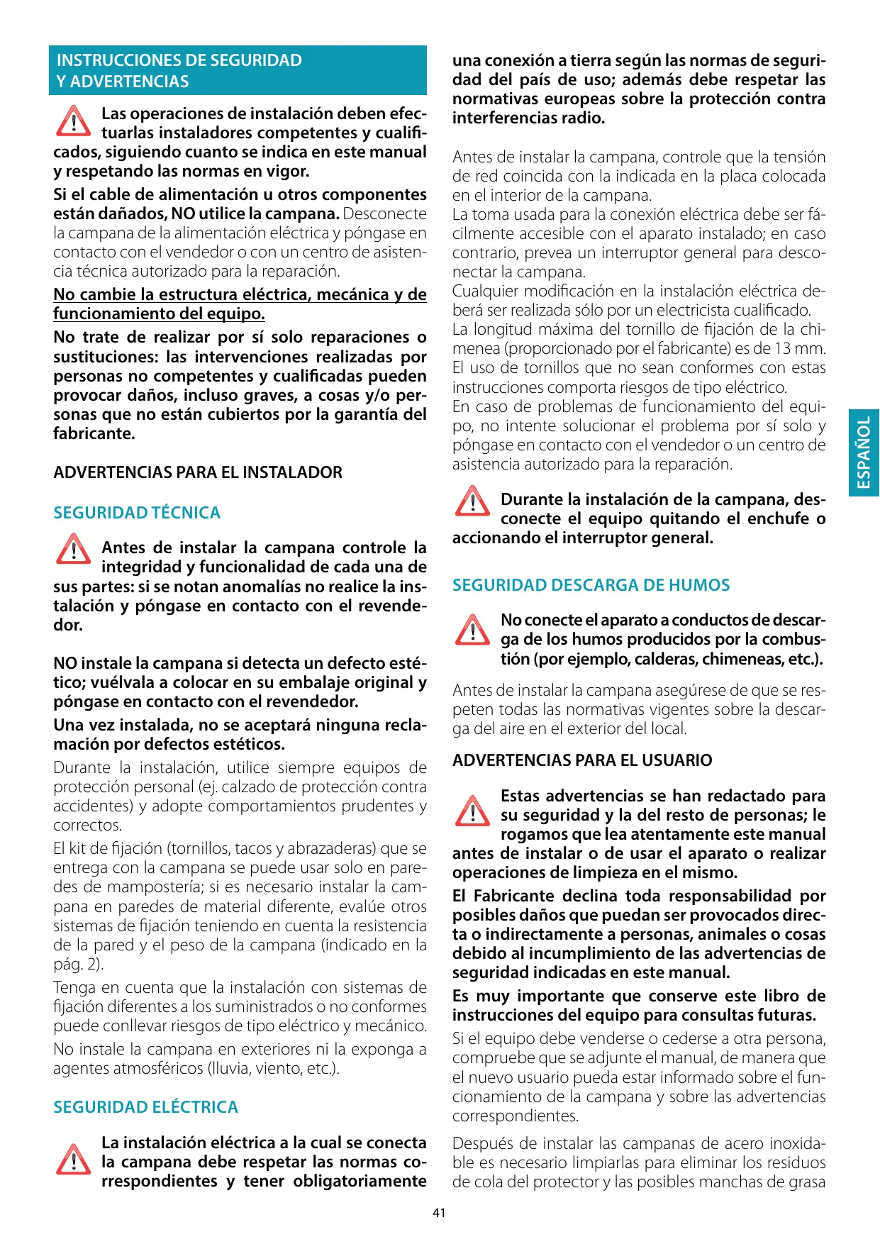 Estas advertencias se han redactado para su seguridad y la del resto de personas; le rogamos que lea atentamente este manual antes de instalar o de usar el aparato o realizar operaciones de limpieza en el mismo. El Fabricante declina toda responsabilidad por posibles daños que puedan ser provocados directa o indirectamente a personas, animales o cosas debido al incumplimiento de las advertencias de seguridad indicadas en este manual. Es muy importante que conserve este libro de instrucciones del equipo para consultas futuras. Si el equipo debe venderse o cederse a otra persona, compruebe que se adjunte el manual, de manera que el nuevo usuario pueda estar informado sobre el funcionamiento de la campana y sobre las advertencias correspondientes.