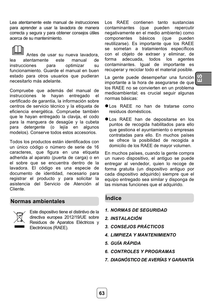 ES Lea atentamente este manual de instrucciones para aprender a usar la lavadora de manera correcta y segura y para obtener consejos útiles acerca de su mantenimiento.