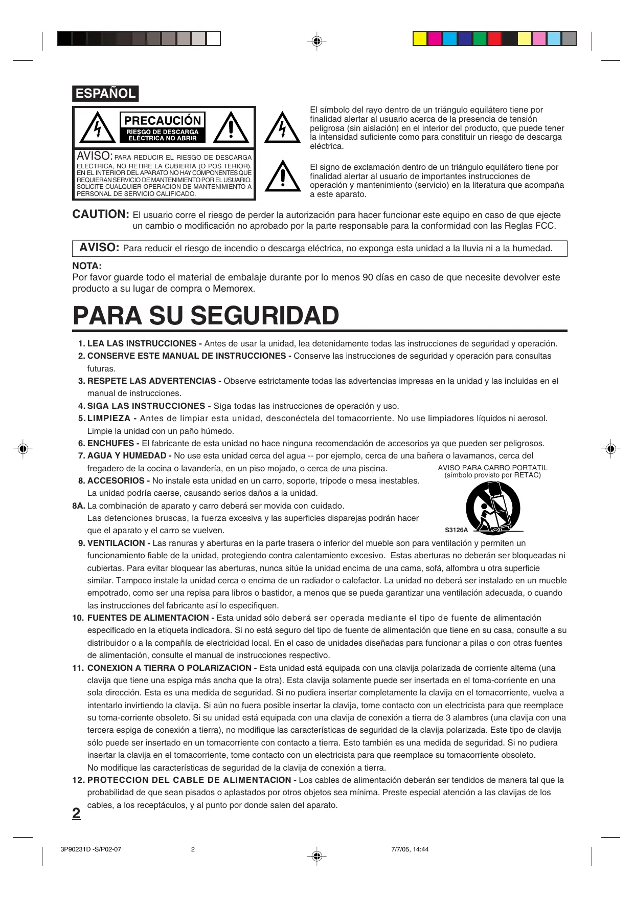 Para informacion adicular sobre los ajustes u operation, favor de visitar notrea pagina web www.disneyelectronics.com o llamar a service a clientes al no. (954) 660-7026. Favor de conservar todo el empaque por lo menos por 90 dias en caso de que tengue que de volver este producto al lugar de compra o a memorex para Obtener refecaciones y accesorios, comunicarse a fox international al no. 1-800-321-6993