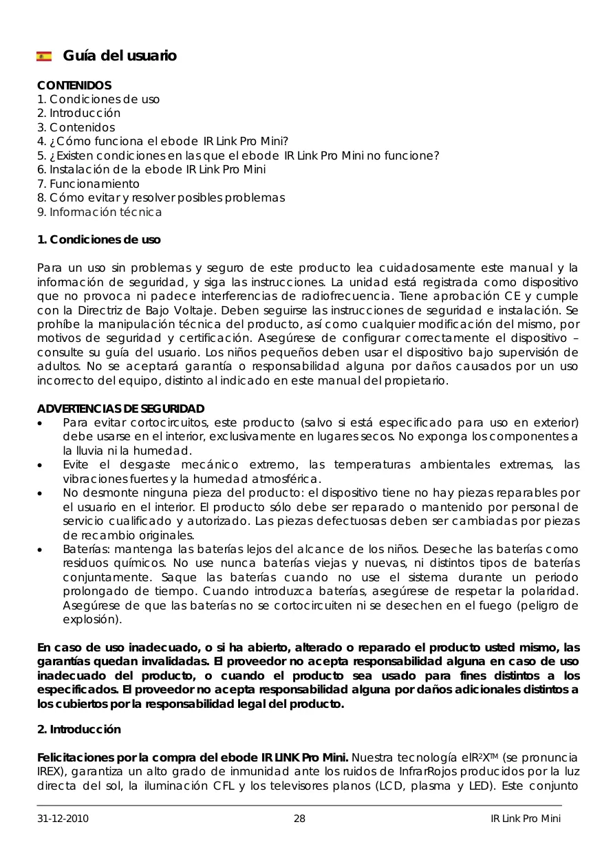 Felicitaciones por la compra del ebode IR LINK Pro Mini. Nuestra Tecnología eR²X™ (se pronunciation IREX), garantiza un alto grado de imúnidad ante los ruidos de Infrar Rojos producidos por la luz directa del sol, la iluminación CFL y losTelevisores planos (LCD, plasma y LED). Esteconjunto