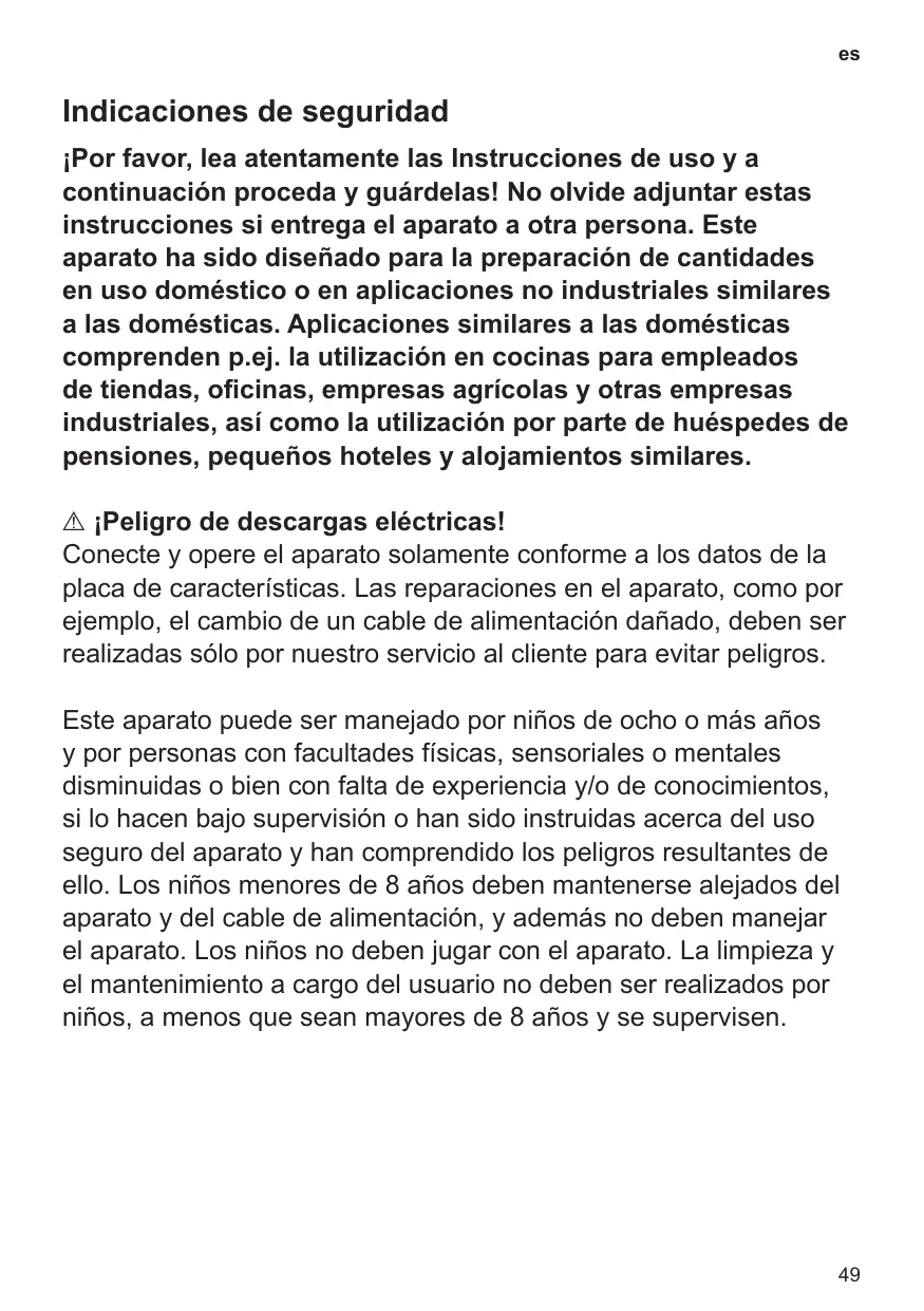 ¡Por favor, lea atentamente las Instrucciones de uso y a continuación proceda y guárdelas! No olvide adjuntar estas instrucciones si entrega el aparato a otra persona. Este aparato ha sido diseñado para la preparación de cantidades en uso doméstico o en aplicaciones no industriales similares a las domésticas. Aplicaciones similares a las domésticas comprenden p.ej. la utilización en cocinas para empleados de tiendas, oficinas, empresas agrícolas y otras empresas industriales, así como la utilización por parte de huéspedes de pensiones, pequeños hoteles y alojamientos similares. ¡ ¡Peligro de descargas eléctricas! Conecte y opere el aparato solamente conforme a los datos de la placa de características. Las reparaciones en el aparato, como por ejemplo, el cambio de un cable de alimentación dañado, deben ser realizadas sólo por nuestro servicio al cliente para evitar peligros. Este aparato puede ser manejado por niños de ocho o más años y por personas con facultades físicas, sensoriales o mentales disminuidas o bien con falta de experiencia y/o de conocimientos, si lo hacen bajo supervisión o han sido instruidas acerca del uso seguro del aparato y han comprendido los peligros resultantes de ello. Los niños menores de 8 años deben mantenerse alejados del aparato y del cable de alimentación, y además no deben manejar el aparato. Los niños no deben jugar con el aparato. La limpieza y el mantenimiento a cargo del usuario no deben ser realizados por niños, a menos que sean mayores de 8 años y se supervisen.