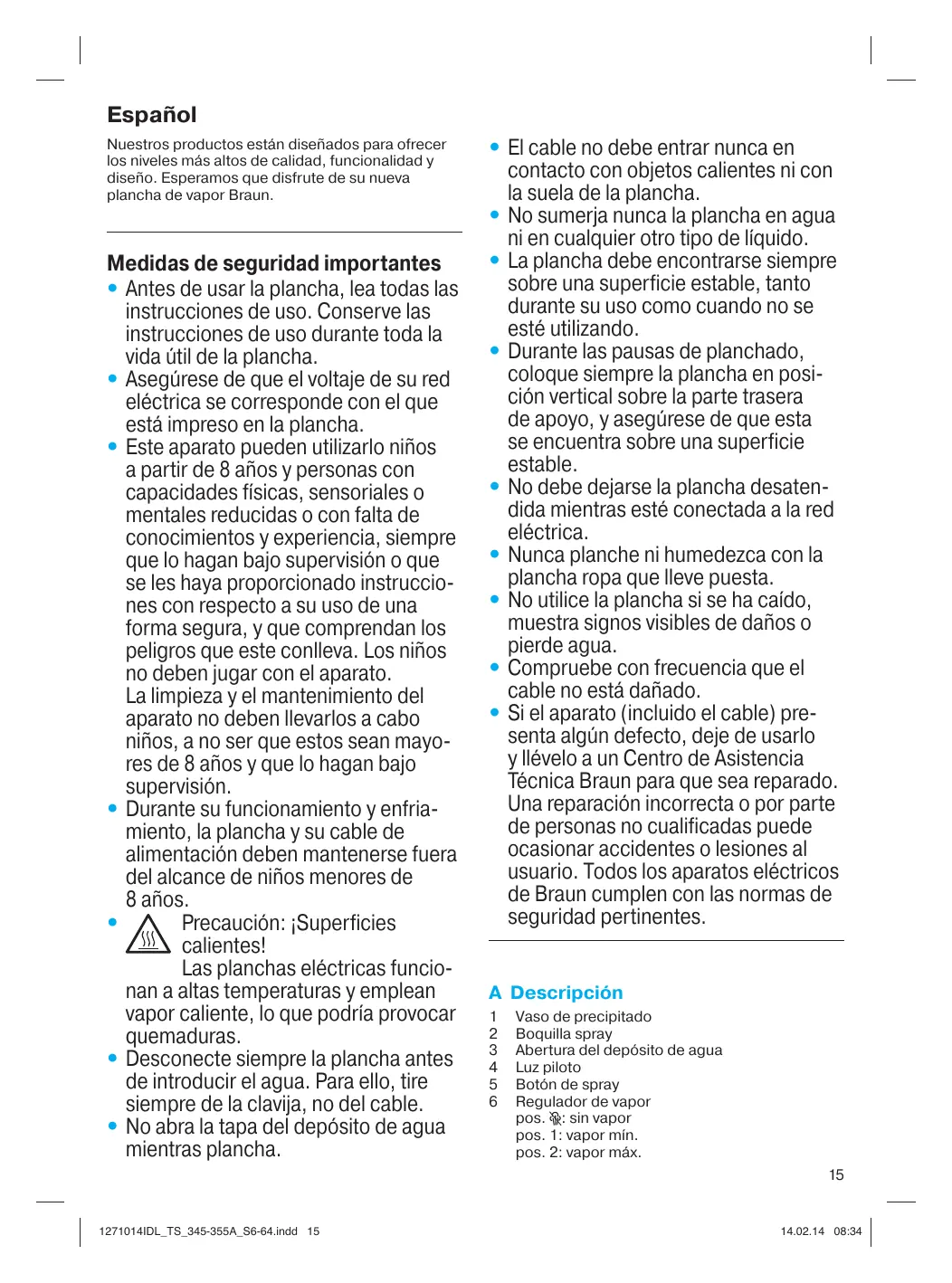 Español Nuestros productos están diseñados para ofrecer los niveles más altos de calidad, funcionalidad y diseño. Esperamos que disfrute de su nueva plancha de vapor Braun. Medidas de seguridad importantes