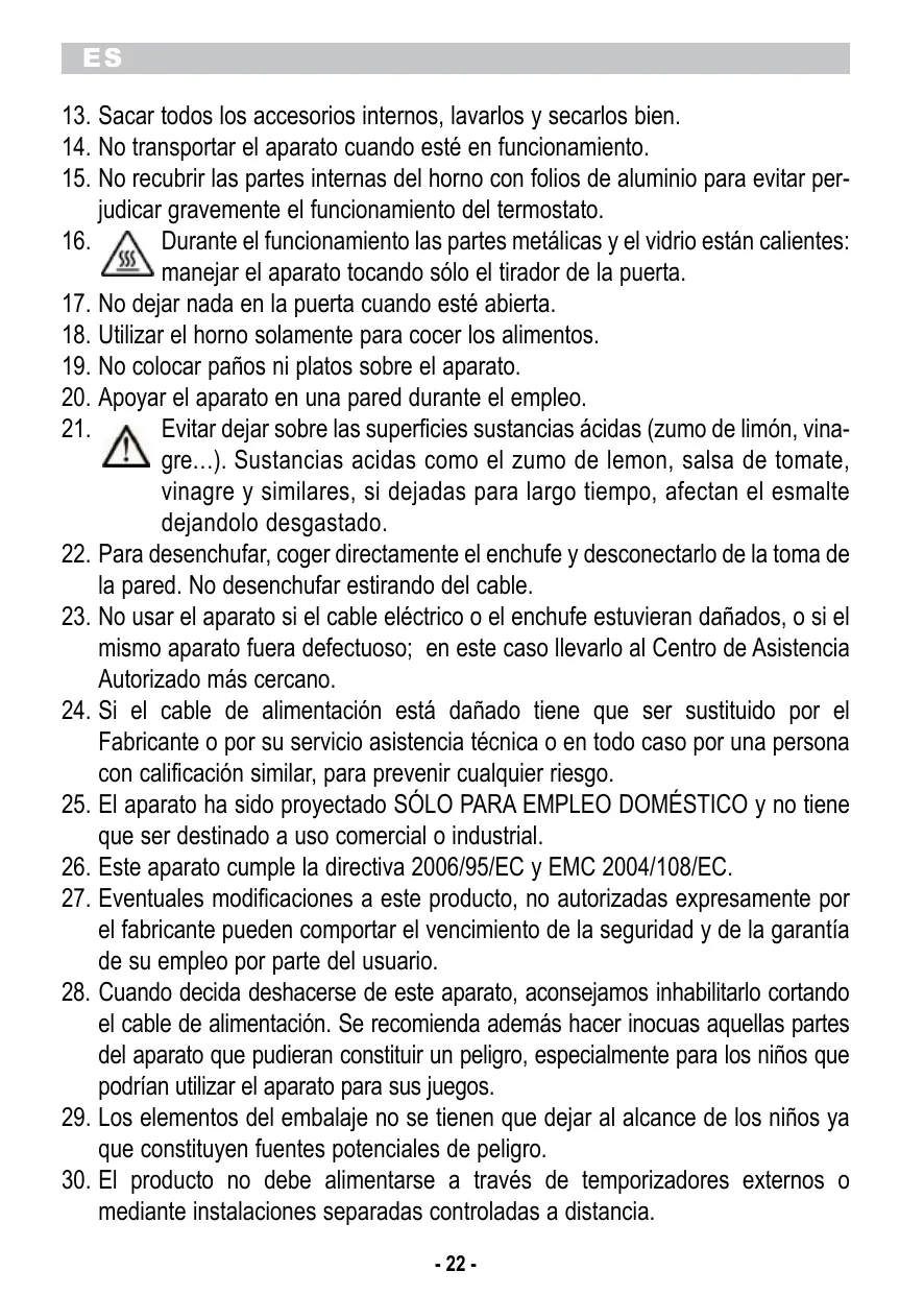 13. Sacar todos los accesorios internos, lavarlos y secarlos bien. 14. No transportar el aparato cuando esté en funcionamiento. 15. No recubrir las partes internas del horno con folios de aluminio para evitar perjudicar gravemente el funcionamiento del termostato. 16. Durante el funcionamiento las partes metálicas y el vidrio están calientes: manejar el aparato tocando sólo el tirador de la puerta. 17. No dejar nada en la puerta cuando esté abierta. 18. Utilizar el horno solamente para cocer los alimentos. 19. No colocar paños ni platos sobre el aparato. 20. Apoyar el aparato en una pared durante el empleo. 21. Evitar dejar sobre las superficies sustancias ácidas (zumo de limón, vinagre…). Sustancias acidas como el zumo de lemon, salsa de tomate, vinagre y similares, si dejadas para largo tiempo, afectan el esmalte dejandolo desgastado. 22. Para desenchufar, coger directamente el enchufe y desconectarlo de la toma de la pared. No desenchufar estirando del cable. 23. No usar el aparato si el cable eléctrico o el enchufe estuvieran dañados, o si el mismo aparato fuera defectuoso; en este caso llevarlo al Centro de Asistencia Autorizado más cercano. 24. Si el cable de alimentación está dañado tiene que ser sustituido por el Fabricante o por su servicio asistencia técnica o en todo caso por una persona con calificación similar, para prevenir cualquier riesgo. 25. El aparato ha sido proyectado SÓLO PARA EMPLEO DOMÉSTICO y no tiene que ser destinado a uso comercial o industrial. 26. Este aparato cumple la directiva 2006/95/EC y EMC 2004/108/EC. 27. Eventuales modificaciones a este producto, no autorizadas expresamente por el fabricante pueden comportar el vencimiento de la seguridad y de la garantía de su empleo por parte del usuario. 28. Cuando decida deshacerse de este aparato, aconsejamos inhabilitarlo cortando el cable de alimentación. Se recomienda además hacer inocuas aquellas partes del aparato que pudieran constituir un peligro, especialmente para los niños que podrían utilizar el aparato para sus juegos. 29. Los elementos del embalaje no se tienen que dejar al alcance de los niños ya que constituyen fuentes potenciales de peligro. 30. El producto no debe alimentarse a través de temporizadores externos o mediante instalaciones separadas controladas a distancia. - 22 -