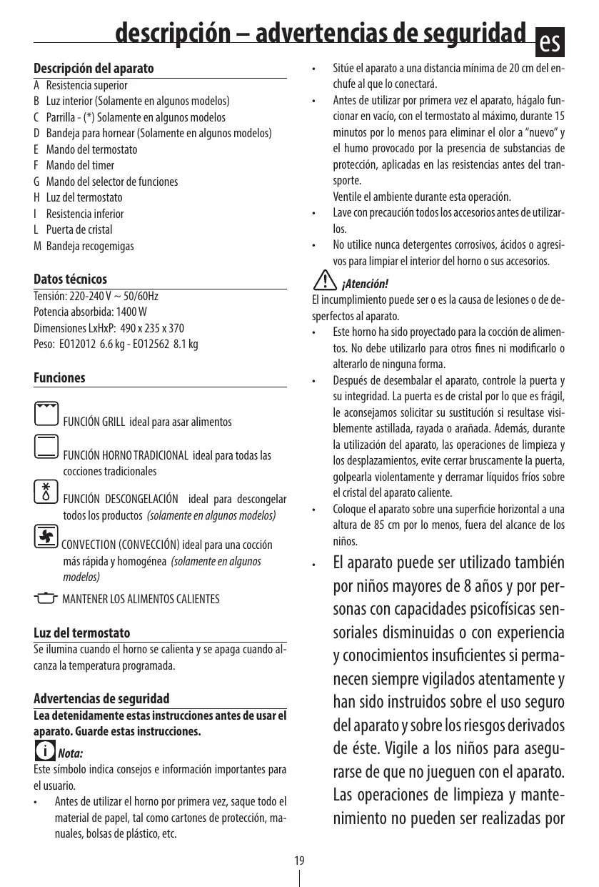 Nota: Este símbolo indica consejos e información importantes para el usuario. • Antes de utilizar el horno por primera vez, saque todo el material de papel, tal como cartones de protección, manuales, bolsas de plástico, etc. 19