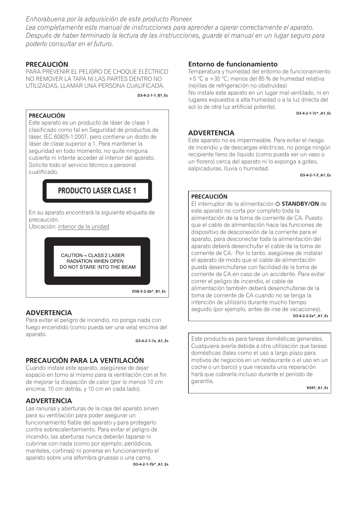 http://www.pioneer.nl - http://www.pioneer.be (of http://www.pioneer.eu) Download een elektronische versie van de handleiding via de website. Para clientes en Europa: Registre su producto en http://www.pioneer.es (o en http://www.pioneer.eu) Descubra los beneficios de registrarse on-line: Descarguese una versión electrónica de este manual desde nuestra web. Uso del menu FUNCTION “x.v.Color” en Sony Corporation. Enhorabuena por la adquisición de este producto Pioneer. Lea completamente este manual de instrucciones para aprender a operar correctamente el aparato. Después de haber terminado la lectura de las instrucciones, guarde el manual en un lugar seguro para poderlo consultar en el futuro. PRECAUCIÓN Entorno de funcionamiento PARA PREVENIR EL PELIGRO DE CHOQUE ELÉCTRICO NO REMOVER LA TAPA NI LAS PARTES DENTRO NO UTILIZADAS, LLAMAR UNA PERSONA CUALIFICADA. Temperatura y humedad del entorno de funcionamiento +5 °C a +35 °C; menos del 85 % de humedad relativa (rejillas de refrigeración no obstruidas) No instale este aparato en un lugar mal ventilado, ni en lugares expuestos a alta humedad o a la luz directa del sol (o de otra luz artificial potente). D3-4-2-1-1_B1_Es PRECAUCIÓN Este aparato es un producto de láser de clase 1 clasificado como tal en Seguridad de productos de láser, IEC 60825-1:2007, pero contiene un diodo de láser de clase superior a 1. Para mantener la seguridad en todo momento, no quite ninguna cubierta ni intente acceder al interior del aparato. Solicite todo el servicio técnico a personal cualificado.