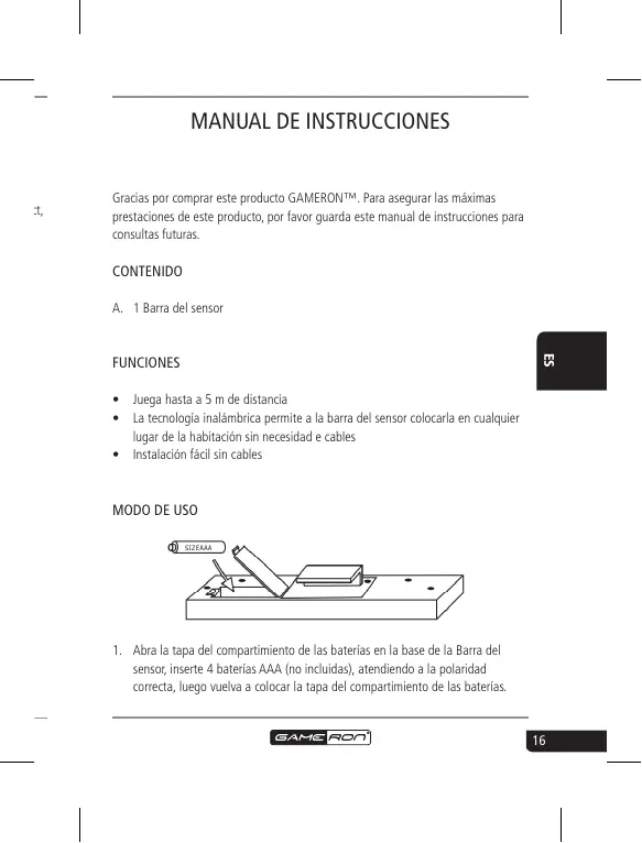 Juega La tec lugar Instal MODO D Gracias por comprar este producto GAMERON™. Para asegurar las máximas prestaciones de este producto, por favor guarda este manual de instrucciones para consultas futuras. CONTENIDO A. 1 Barra del sensor