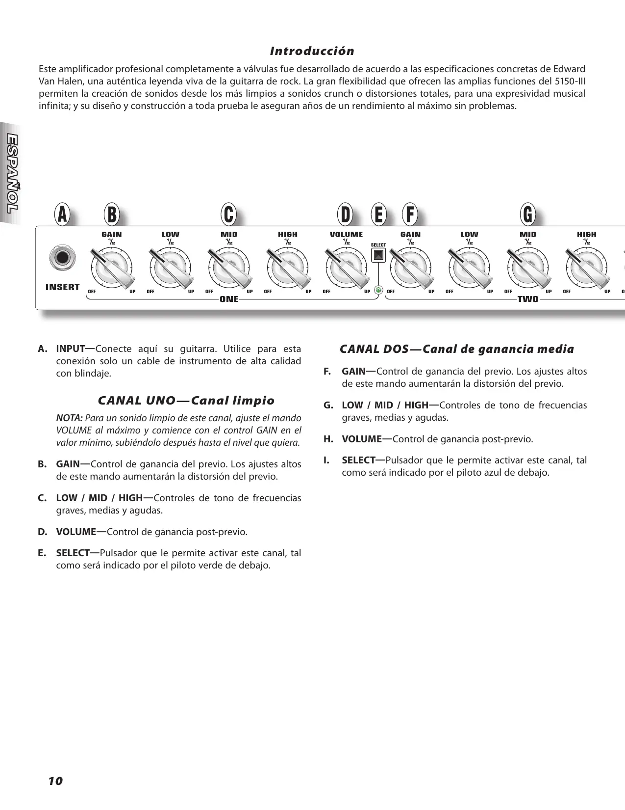 ONE Y . TWO THREE Introducción Este amplificador profesional completamente a válvulas fue desarrollado de acuerdo a las especificaciones concretas de Edward Van Halen, una auténtica leyenda viva de la guitarra de rock. La gran flexibilidad que ofrecen las amplias funciones del 5150-III permiten la creación de sonidos desde los más limpios a sonidos crunch o distorsiones totales, para una expresividad musical infinita; y su diseño y construcción a toda prueba le aseguran años de un rendimiento al máximo sin problemas. A . INPUT—Conecte aquí su guitarra. Utilice para esta conexión solo un cable de instrumento de alta calidad con blindaje. canaL uno—canal limpio NOTA: Para un sonido limpio de este canal, ajuste el mando VOLUME al máximo y comience con el control GAIN en el valor mínimo, subiéndolo después hasta el nivel que quiera. B . GAIN—Control de ganancia del previo. Los ajustes altos de este mando aumentarán la distorsión del previo. C . LOW / MID / HIGH—Controles de tono de frecuencias graves, medias y agudas. D . VOLUME—Control de ganancia post-previo. E . SELECT—Pulsador que le permite activar este canal, tal como será indicado por el piloto verde de debajo.