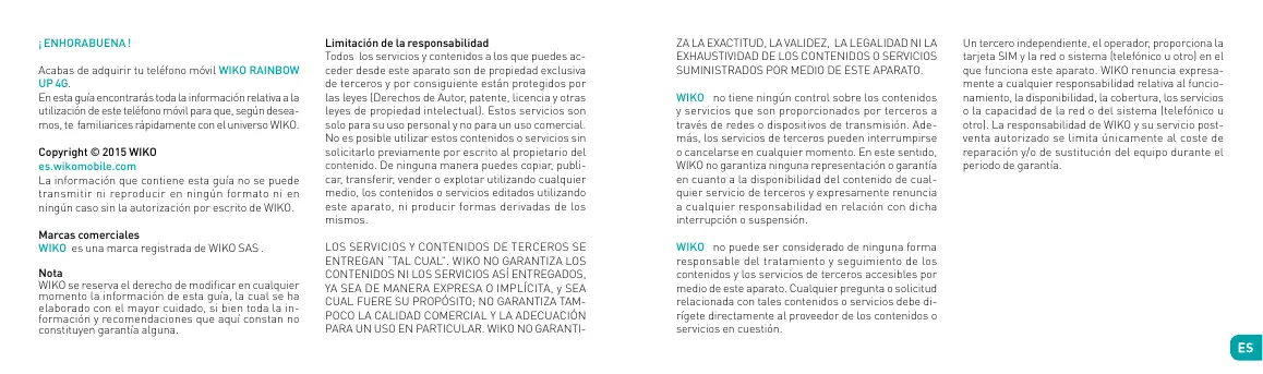 Un opérateur tiers, indépendant, fournir la carte SIM et le réseau ou système (cellulaire ou autre) sur lequel cet apparéil fonctionné. WIKO rejette expressesment toute responsabilité relative au fonctionnement, à la disponibilité, à la couverture, aux services ou à la capacité du réseau ou système (cellulaire ou autre). La responsabilité de WIKO et de son service après-venture agree se limite uniquement au coût de la réparation et/ou du remplacement de l'unité pendant la période de garantie.