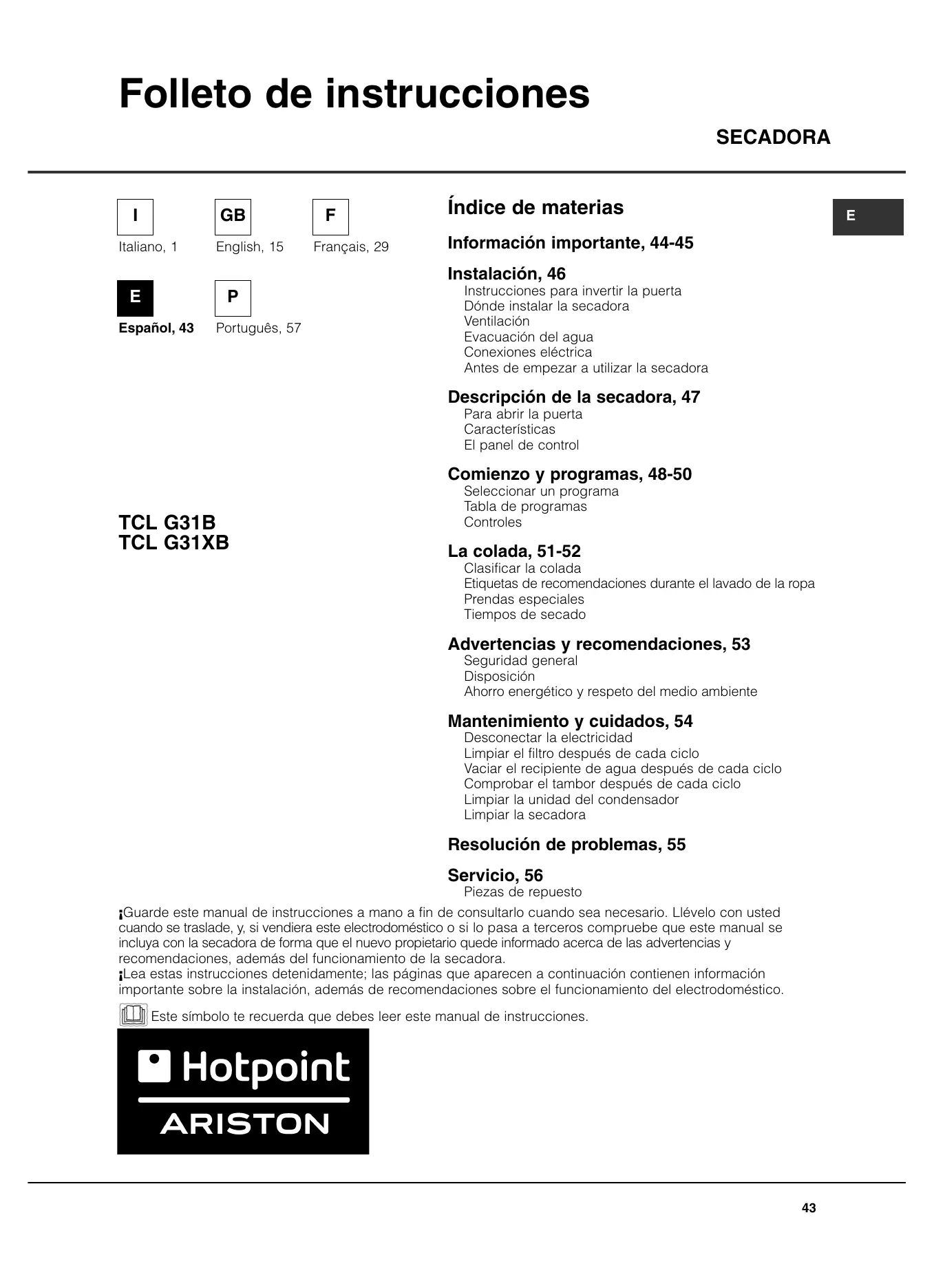 Servicio, 56 Piezas de repuesto ¡Guarde este manual de instrucciones a mano a fin de consultarlo cuando sea necesario. Llévelo con usted cuando se traslade, y, si vendiera este electrodoméstico o si lo pasa a terceros compruebe que este manual se incluya con la secadora de forma que el nuevo propietario quede informado acerca de las advertencias y recomendaciones, además del funcionamiento de la secadora. ¡Lea estas instrucciones detenidamente; las páginas que aparecen a continuación contienen información importante sobre la instalación, además de recomendaciones sobre el funcionamiento del electrodoméstico. Este símbolo te recuerda que debes leer este manual de instrucciones.