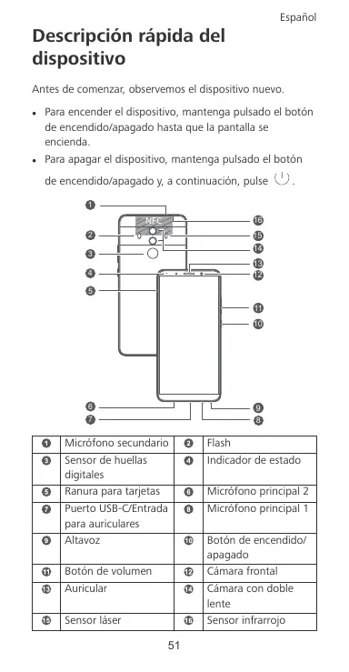Micrófono secundario Flash Sensor de huellas digitales Ranura para tarjetas Indicador de estado Puerto USB-C/Entrada para auriculares Altavoz Micrófono principal 1 Micrófono principal 2 Botón de volumen Auricular Botón de encendido/ apagado Cámara frontal Cámara con doble lente Sensor infrarrojo Sensor láser