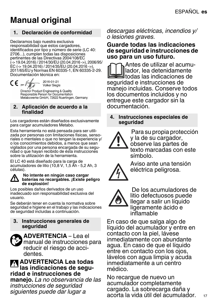 1. Declaración de conformidad Declaramos bajo nuestra exclusiva responsabilidad que estos cargadores, identificados por tipo y número de serie (LC 40: 2706...), cumplen todas las disposiciones pertinentes de las Directivas 2004/108/EC (-> 19.04.2016) / 2014/30/EU (20.04.2016 ->), 2006/95/ EC (-> 19.04.2016) / 2014/35/EU (20.04.2016 ->), 2011/65/EU y Normas EN 60335-1, EN 60335-2-29. Documentación técnica en: