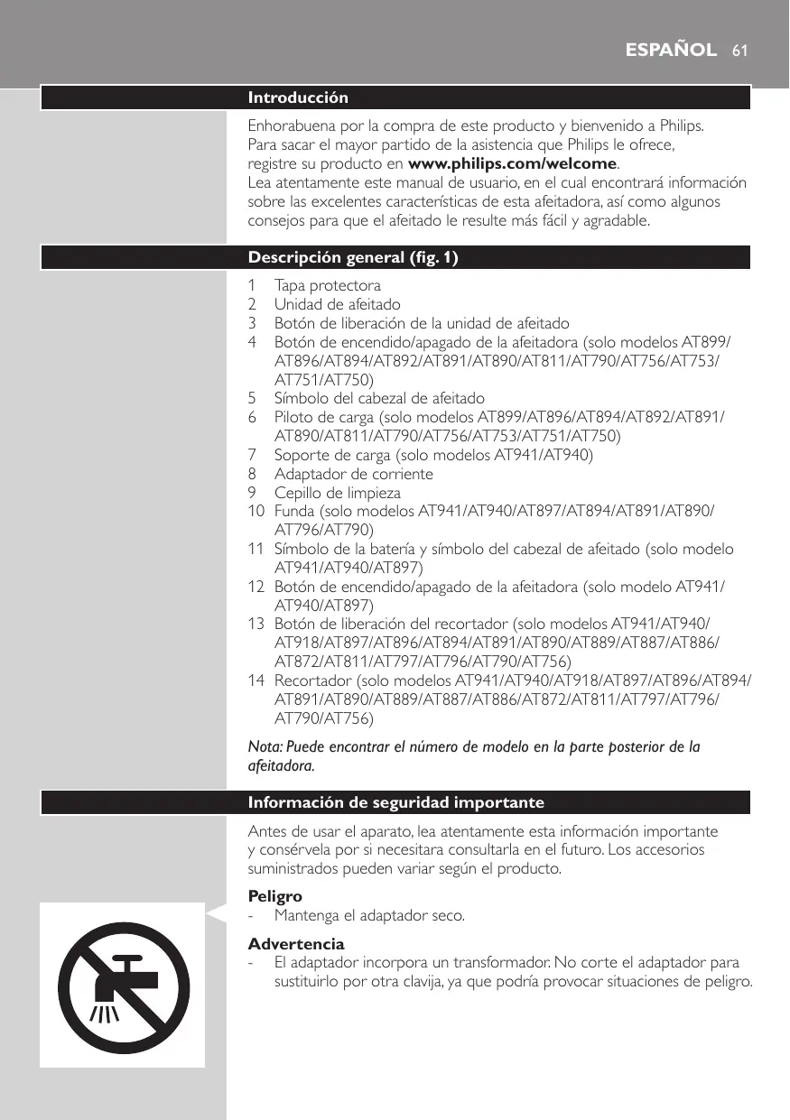 ESPAÑOL 61 Introducción Enhorabuena por la compra de este producto y bienvenido a Philips. Para sacar el mayor partido de la asistencia que Philips le ofrece, registre su producto en www.philips.com/welcome. Lea atentamente este manual de usuario, en el cual encontrará información sobre las excelentes características de esta afeitadora, así como algunos consejos para que el afeitado le resulte más fácil y agradable. Descripción general (fig. 1)