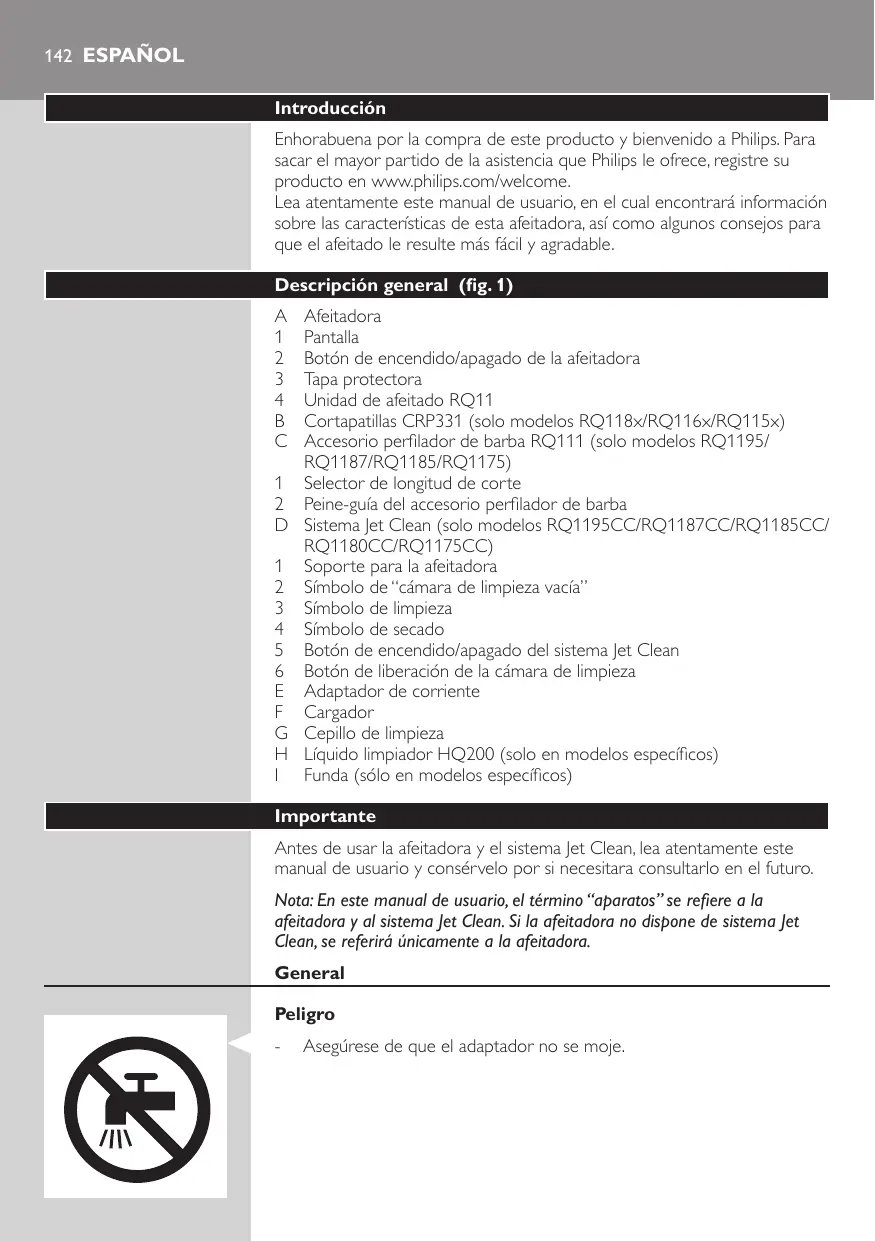 Pantalla Botón de encendido/apagado de la afeitadora Tapa protectora Unidad de afeitado RQ11 Cortapatillas CRP331 (solo modelos RQ118x/RQ116x/RQ115x) Accesorio perfilador de barba RQ111 (solo modelos RQ1195/ RQ1187/RQ1185/RQ1175) 1 Selector de longitud de corte 2 Peine-guía del accesorio perfilador de barba D Sistema Jet Clean (solo modelos RQ1195CC/RQ1187CC/RQ1185CC/ RQ1180CC/RQ1175CC) 1 Soporte para la afeitadora 2 Símbolo de “cámara de limpieza vacía” 3 Símbolo de limpieza 4 Símbolo de secado 5 Botón de encendido/apagado del sistema Jet Clean 6 Botón de liberación de la cámara de limpieza E Adaptador de corriente F Cargador G Cepillo de limpieza H Líquido limpiador HQ200 (solo en modelos específicos) I Funda (sólo en modelos específicos) Importante Antes de usar la afeitadora y el sistema Jet Clean, lea atentamente este manual de usuario y consérvelo por si necesitara consultarlo en el futuro. Nota: En este manual de usuario, el término “aparatos” se refiere a la afeitadora y al sistema Jet Clean. Si la afeitadora no dispone de sistema Jet Clean, se referirá únicamente a la afeitadora. General Peligro -- Asegúrese de que el adaptador no se moje.