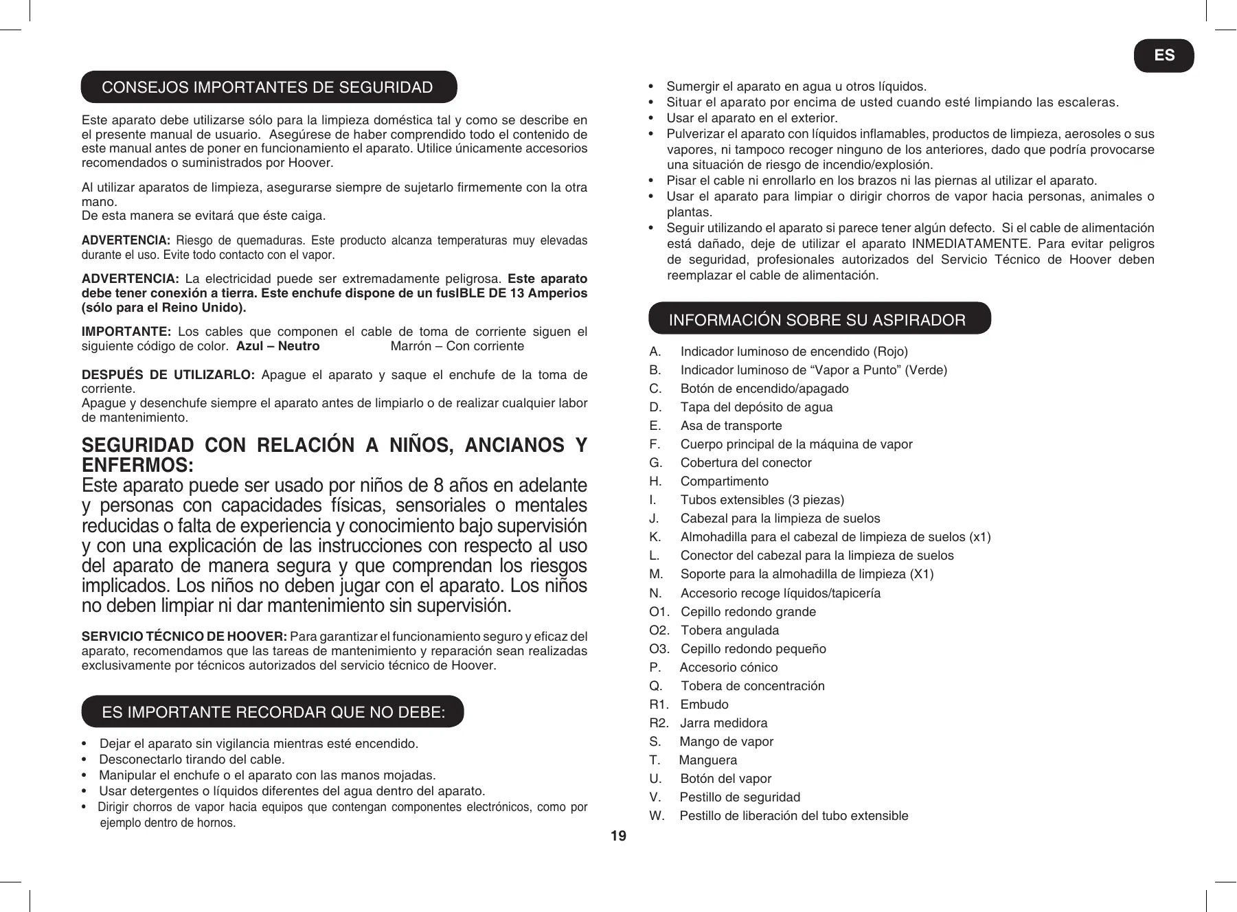 ADVERTENCIA: Riesgo de quemaduras. Este producto alcanza temperaturas muy elevadas durante el uso. Evite todo contacto con el vapor. ADVERTENCIA: La electricidad puede ser extremadamente peligrosa. Este aparato debe tener conexión a tierra. Este enchufe dispone de un fusible de 13 amperios (sólo para el Reino Unido). Información sobre su aspirador Importante: Los cables que componen el cable de toma de corriente siguen el siguiente código de color. Azul – Neutro Marrón – Con corriente DESPUÉS DE UTILIZARLO: Apague el aparato y saque el enchufe de la toma de corriente. Apague y desenchufe siempre el aparato antes de limpiarlo o de realizar cualquier labor de mantenimiento. SEGURIDAD CON RELACIÓN A NIÑOS, ANCIANOS Y ENFERMOS: Este aparato puede ser usado por niños de 8 años en adelante y personas con capacidades físicas, sensoriales o mentales reducidas o falta de experiencia y conocimiento bajo supervisión y con una explicación de las instrucciones con respecto al uso del aparato de manera segura y que comprendan los riesgos implicados. Los niños no deben jugar con el aparato. Los niños no deben limpiar ni dar mantenimiento sin supervisión. SERVICIO TÉCNICO DE HOOVER: Para garantizar el funcionamiento seguro y eficaz del aparato, recomendamos que las tareas de mantenimiento y reparación sean realizadas exclusivamente por técnicos autorizados del servicio técnico de Hoover. Es importante recordar que no debe: