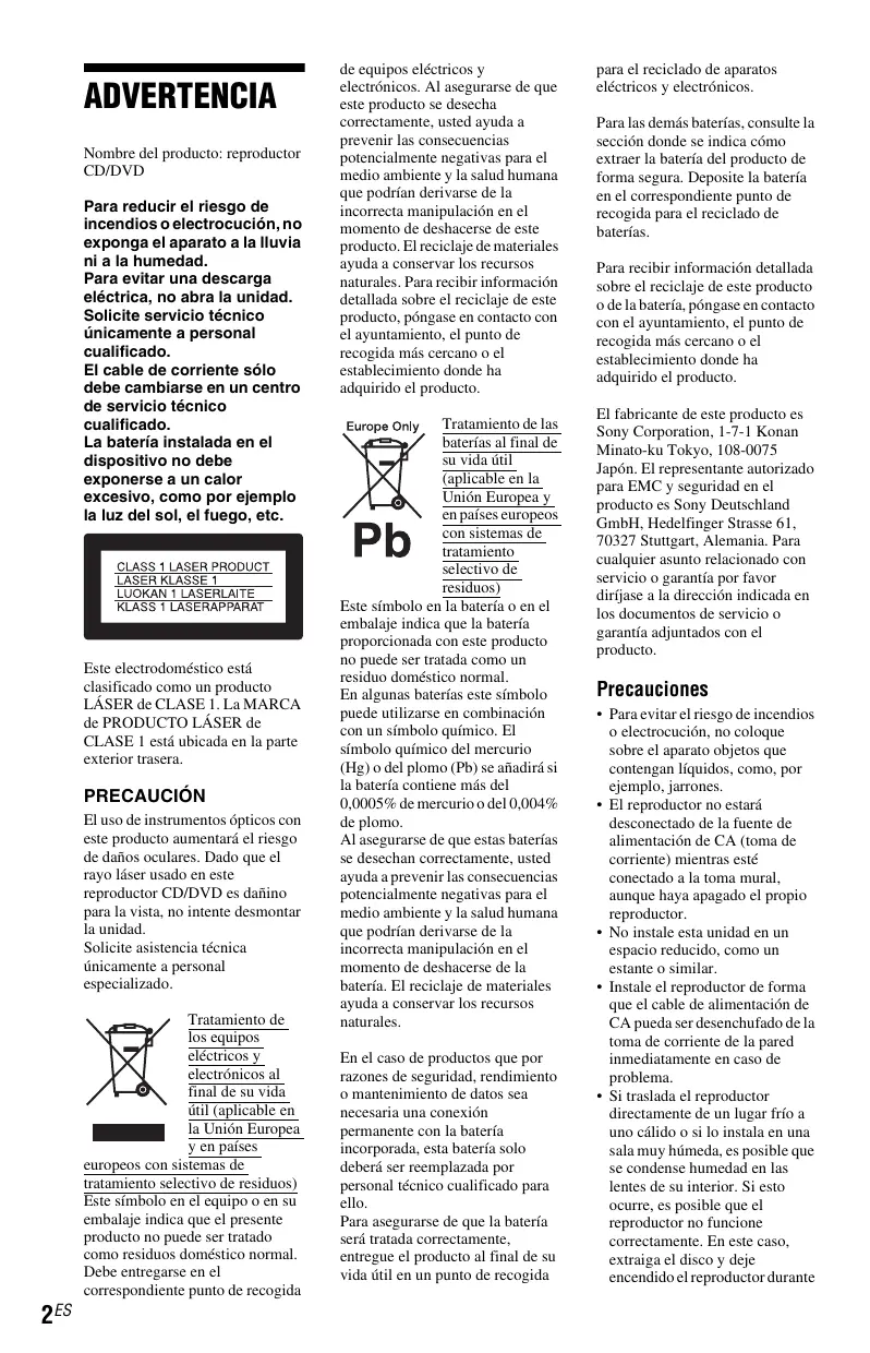 Para las demás baterías, consulte la sección donde se indica cómo extraer la batería del producto de forma segura. Deposite la batería en el correspondiente punto de recogida para el reciclado de baterías. Para recibir información detallada sobre el reciclaje de este producto o de la batería, póngase en contacto con el ayuntamiento, el punto de recogida más cercano o el establecimiento donde ha adquirido el producto. El fabricante de este producto es Sony Corporation, 1-7-1 Konan Minato-ku Tokyo, 108-0075 Japón. El representante autorizado para EMC y seguridad en el producto es Sony Deutschland GmbH, Hedelfinger Strasse 61, 70327 Stuttgart, Alemania. Para cualquier asunto relacionado con servicio o garantía por favor diríjase a la dirección indicada en los documentos de servicio o garantía adjuntados con el producto.
