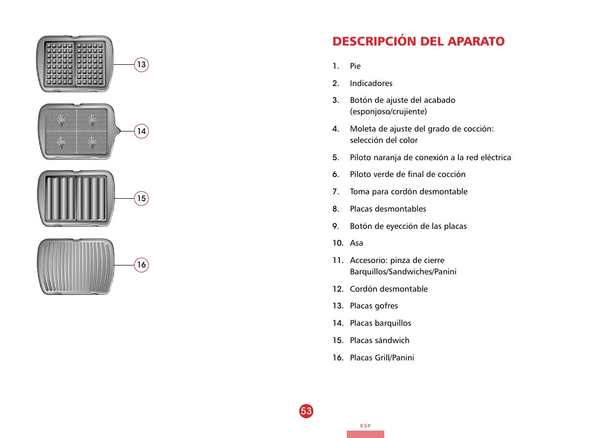 | Características técnicas principales | Dispositivo para hacer waffles y obleas |