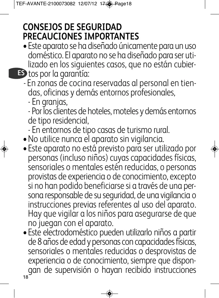 CONSEJOS DE SEGURIDAD PRECAUCIONES IMPORTANTES •Este aparato se ha diseñado únicamente para un uso doméstico. El aparato no se ha diseñado para ser utilizado en los siguientes casos, que no están cubierES tos por la garantía: - En zonas de cocina reservadas al personal en tiendas, oficinas y demás entornos profesionales, - En granjas, - Por los clientes de hoteles, moteles y demás entornos de tipo residencial, - En entornos de tipo casas de turismo rural. •No utilice nunca el aparato sin vigilancia. •Este aparato no está previsto para ser utilizado por personas (incluso niños) cuyas capacidades físicas, sensoriales o mentales estén reducidas, o personas provistas de experiencia o de conocimiento, excepto si no han podido beneficiarse si a través de una persona responsable de su seguridad, de una vigilancia o instrucciones previas referentes al uso del aparato. Hay que vigilar a los niños para asegurarse de que no juegan con el aparato. •Este electrodoméstico pueden utilizarlo niños a partir de 8 años de edad y personas con capacidades físicas, sensoriales o mentales reducidas o desprovistas de experiencia o de conocimiento, siempre que dispongan de supervisión o hayan recibido instrucciones 18