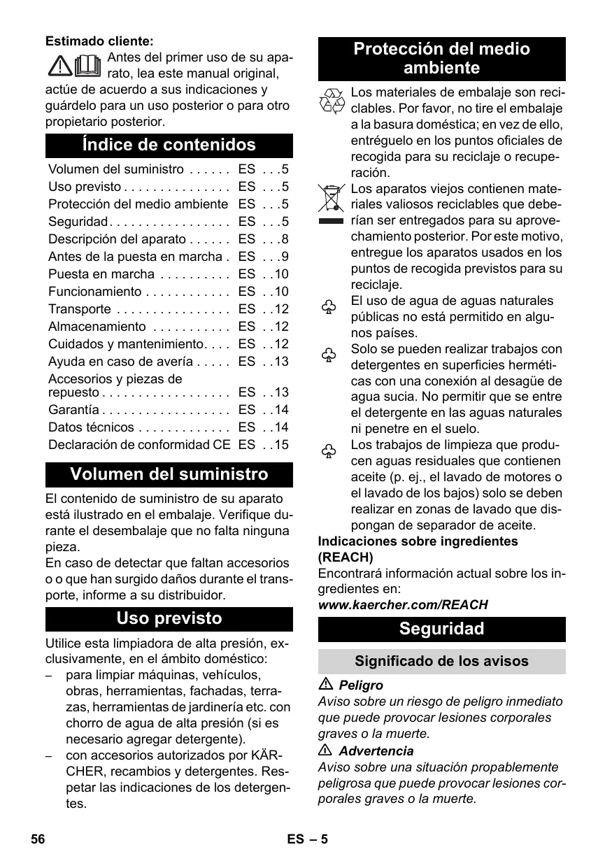 Los materiales de embalaje son reciclables. Por favor, no tire el embalaje a la basura doméstica; en vez de ello, entréguelo en los puntos oficiales de recogida para su reciclaje o recuperación. Los aparatos viejos contienen materiales valiosos reciclables que deberían ser entregados para su aprovechamiento posterior. Por este motivo, entregue los aparatos usados en los puntos de recogida previstos para su reciclaje. El uso de agua de aguas naturales públicas no está permitido en algunos países. Solo se pueden realizar trabajos con detergentes en superficies herméticas con una conexión al desagüe de agua sucia. No permitir que se entre el detergente en las aguas naturales ni penetre en el suelo. Los trabajos de limpieza que producen aguas residuales que contienen aceite (p. ej., el lavado de motores o el lavado de los bajos) solo se deben realizar en zonas de lavado que dispongan de separador de aceite. Indicaciones sobre ingredientes (REACH) Encontrará información actual sobre los ingredientes en: