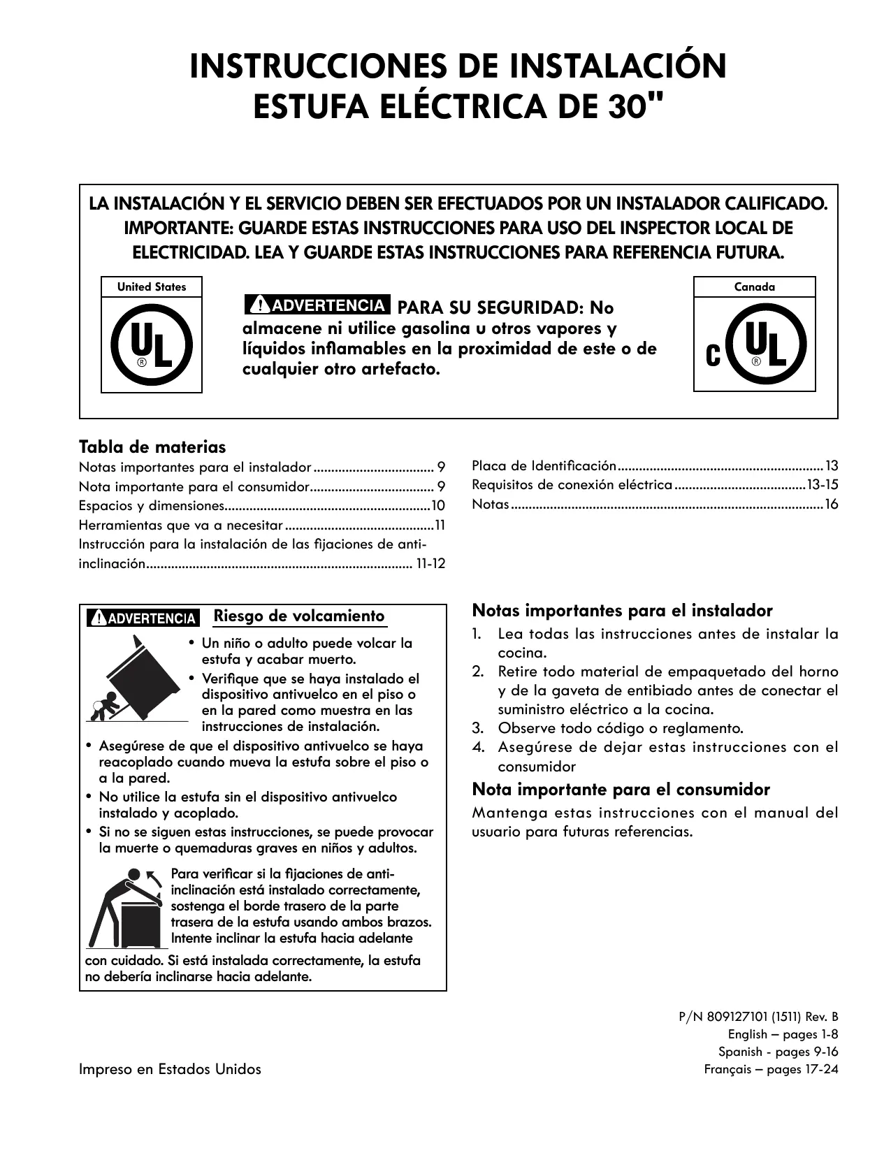 - LA INSTALACIÓN Y EL SERVICIO DEBEN SER EFECTUADOS POR UN INSTALADOR CALIFICADO. IMPORTANTE: GUARDE ESTAS INSTRUCCIONES PARA USO DEL INSPECTOR LOCAL DE ELECTRICIDAD. LEA Y GUARDE ESTAS INSTRUCCIONES PARA REFERENCIA FUTURA. United States Canada PARA SU SEGURIDAD: No almacene ni utilice gasolina u otros vapores y líquidos inflamables en la proximidad de este o de cualquier otro artefacto. Tabla de materias Notas importantes para el instalador p. 9